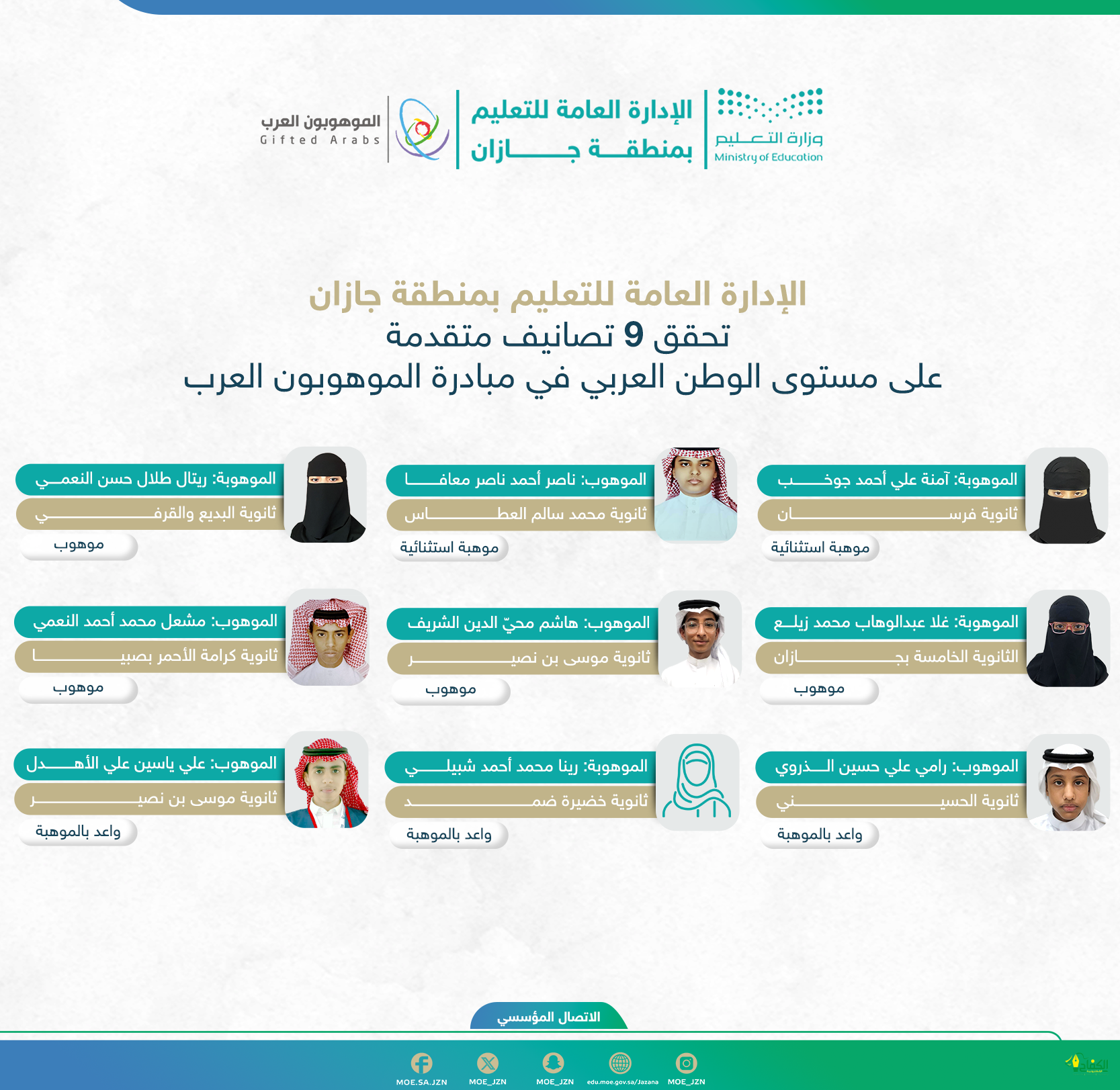 حققت الإدارة العامة للتعليم بمنطقة جازان تسعة تصانيف متقدمة على مستوى الوطن العربي في مبادرة “الموهوبون العرب” في دورتها للعام الحالي 2024م ، التي نظمتها مؤسسة الملك عبد العزيز ورجاله للموهبة والإبداع “موهبة”؛ لاكتشاف ورعاية وتمكين المواهب العربية الشابة، بالشراكة مع المنظمة العربية للتربية والثقافة والعلوم “الألكسو” وهيئة تقويم التعليم والتدريب.