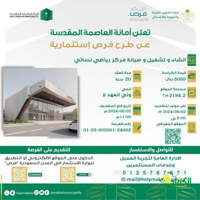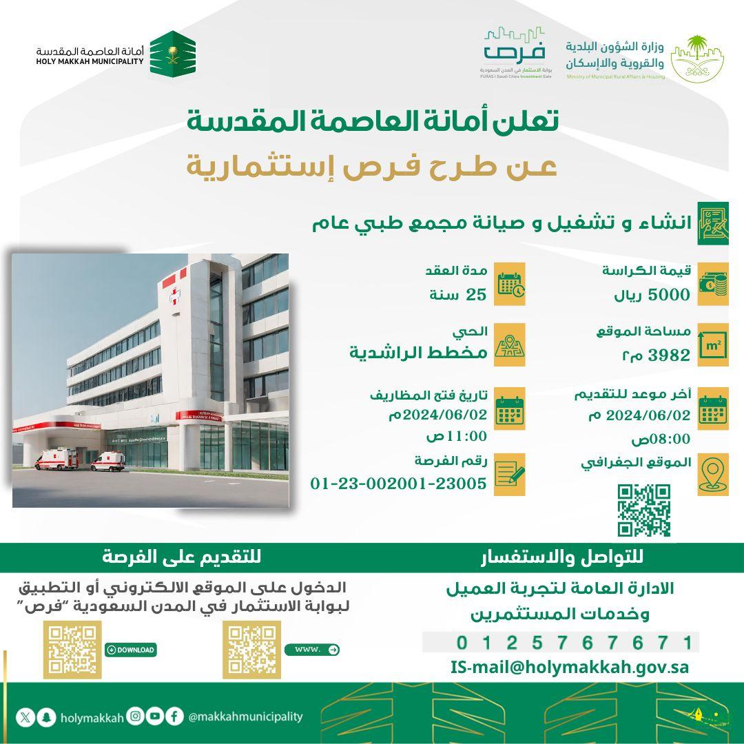 أعلنت أمانة العاصمة المقدسة ممثلةً في الإدارة العامة للاستثمار، عن تمديد طرح الفرص الاستثمارية بمختلف الأنشطة والمواقع المتعددة بمدينة مكة المكرمة؛ بهدف تنشيط الحركة الاقتصادية ، وإتاحة الفرصة لعدد أكبر من المستثمرين للتقدم على المشاريع الاستثمارية المطروحة، وتوفير خيارات متعددة لأهالي وزاور العاصمة المقدسة.