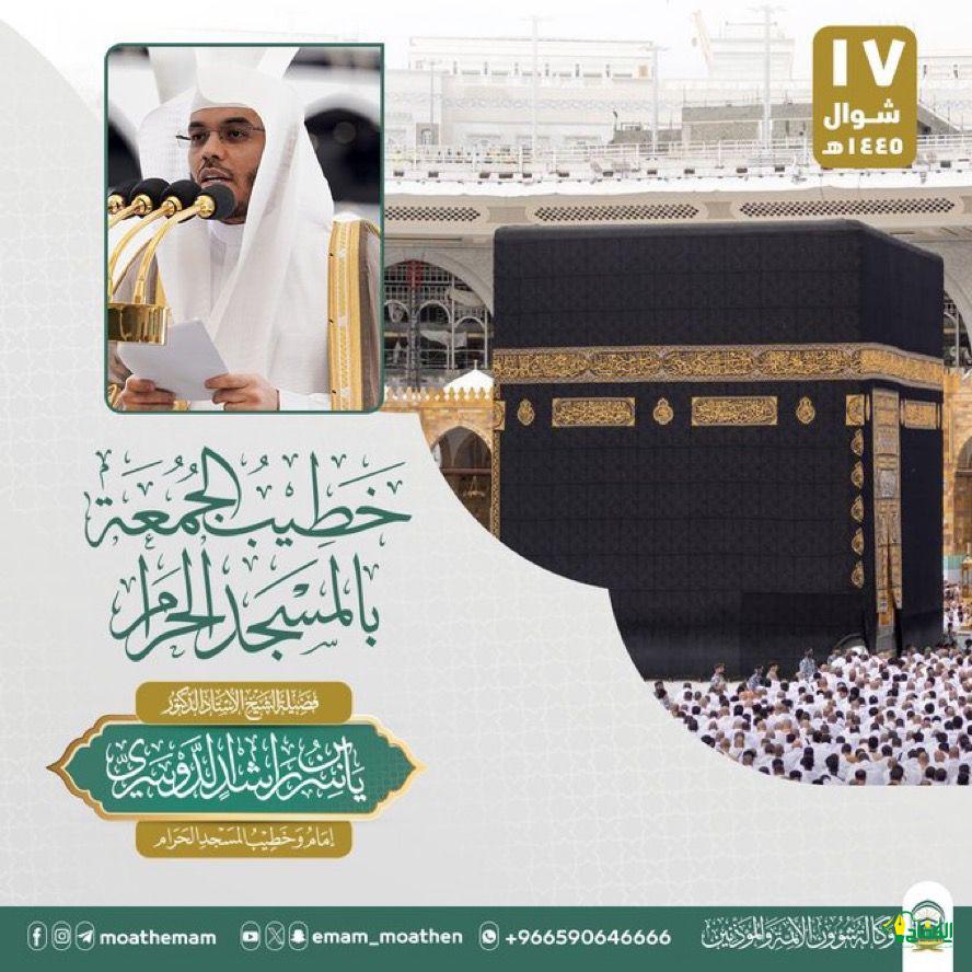 أعلنت رئاسة الشؤون الدينية بالمسجد الحرام والمسجد النبوي عن تكليف خطبة الجمعة ـ ١٧ شوال ١٤٤٥هـ للمسجد الحرام والمسجد النبوي على النحو التالي : سيكون خطيب الجمعة بالمسجد الحرام فضيلة الشيخ الاستاذ الدكتور ياسر الدوسري وفي بالمسجد النبوي فضيلة الشيخ الدكتور علي الحذيفي.