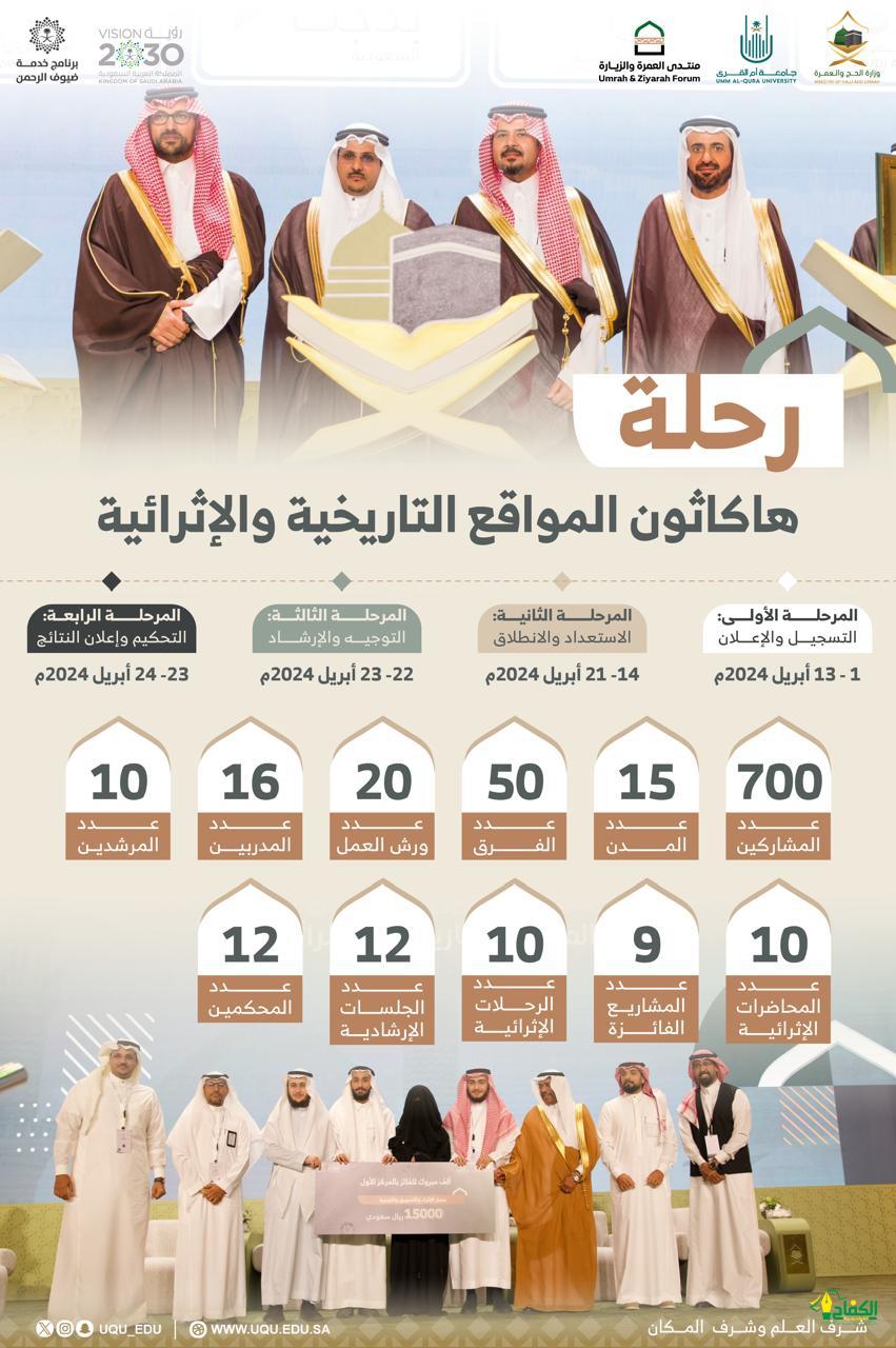 اختتمت جامعة أمِّ القرى و وزارة الحجّ والعمرة أعمال هاكاثون المواقع التَّاريخيَّة والإثرائيَّة؛ والذي أطلقته في أول شهر أبريل عام 2024م، وقد كرَّم معالي نائب وزير الحج والعمرة د. عبد الفتاح مشاط الفرق الفائزة في: “هاكاثون المواقع التَّاريخيَّة والإثرائيَّة”؛ والمقام ضمن الفعاليات المصاحبة لمنتدى العمرة والزيارة الذي نظمته وزارة الحج والعمرة في مركز الملك سلمان الدولي للمؤتمرات بالمدينة المنورة؛ خلال الفترة من: 22-24 أبريل 2024م؛ وذلك بهدف إثراء تجربة ضيوف الرحمن الثقافية والدينية؛ من خلال استثمار العقول المبتكرة في أجواء من التحدي والمنافسة؛ وشارك ما يقارب 700 مشارك من 15 مدينة في المملكة العربية السعودية؛ و بمشاركة 12 محكمًا، و 16 مدربًا، و 10 مرشدين من مختلف الجهات ذات العلاقة. وقدم خلاله 20 دورة تدريبية ، و 6 رحلات تثقيفية ، 10 محاضرات تثقيفية ، و 12 جلسة إرشادية.