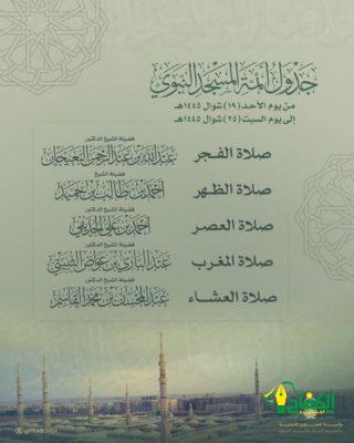 اما في المسجد النبوي الشريف يؤم المصلين في صلاة الفجر فضيلة الشيخ الدكتور عبدالله البعيجان وصلاة الظهر فضيلة الشيخ أحمد بن حميد وصلاة العصر فضيلة الشيخ الدكتور أحمد الحذيفي وصلاة المغرب فضيلة الشيخ الدكتور عبدالباري الثبيتي وصلاة العشاء فضيلة الشيخ الدكتور عبدالمحسن القاسم.