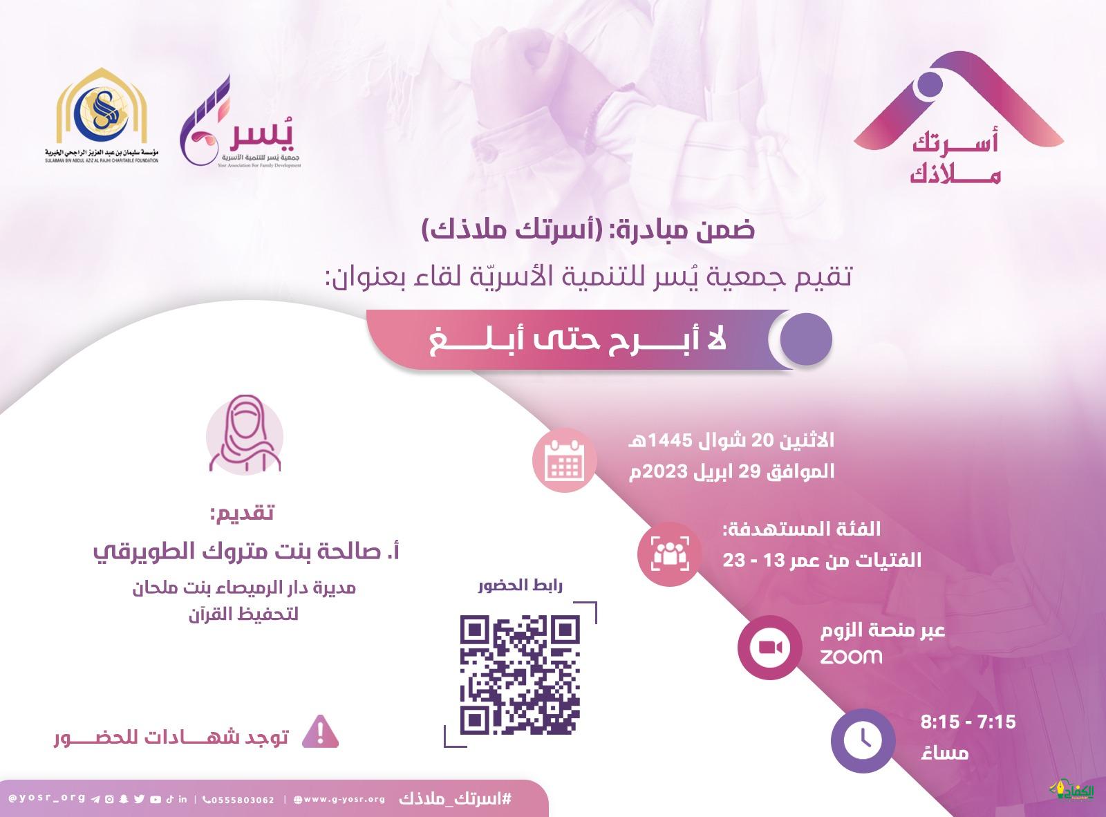 ضمن البرامج والأنشطة والفعاليات والمبادرات التي تقوم بها جمعية يسر للتنمية الأسرية بمكة المكرمة (وضمن مبادرة أسرتك ملاذك) تقيم الجمعية لقاء بعنوان : (لا أبرح حتى أبلغ) أوضحت ذلك الأستاذة الدكتورة هيفاء عثمان فدا – رئيسة مجلس إدارة الجمعية واشارت بأن اللقاء من تقديم الأستاذة: صالحة بنت متروك الطويرقي (مديرة دار الرميصاء بنت ملحان لتحفيظ القرآن) وتتضمن محاور اللقاء: أهدافي كيف ولماذا؟ عقبات في الطريق كيف أحقق أهدافي؟ الغاية الكبرى.