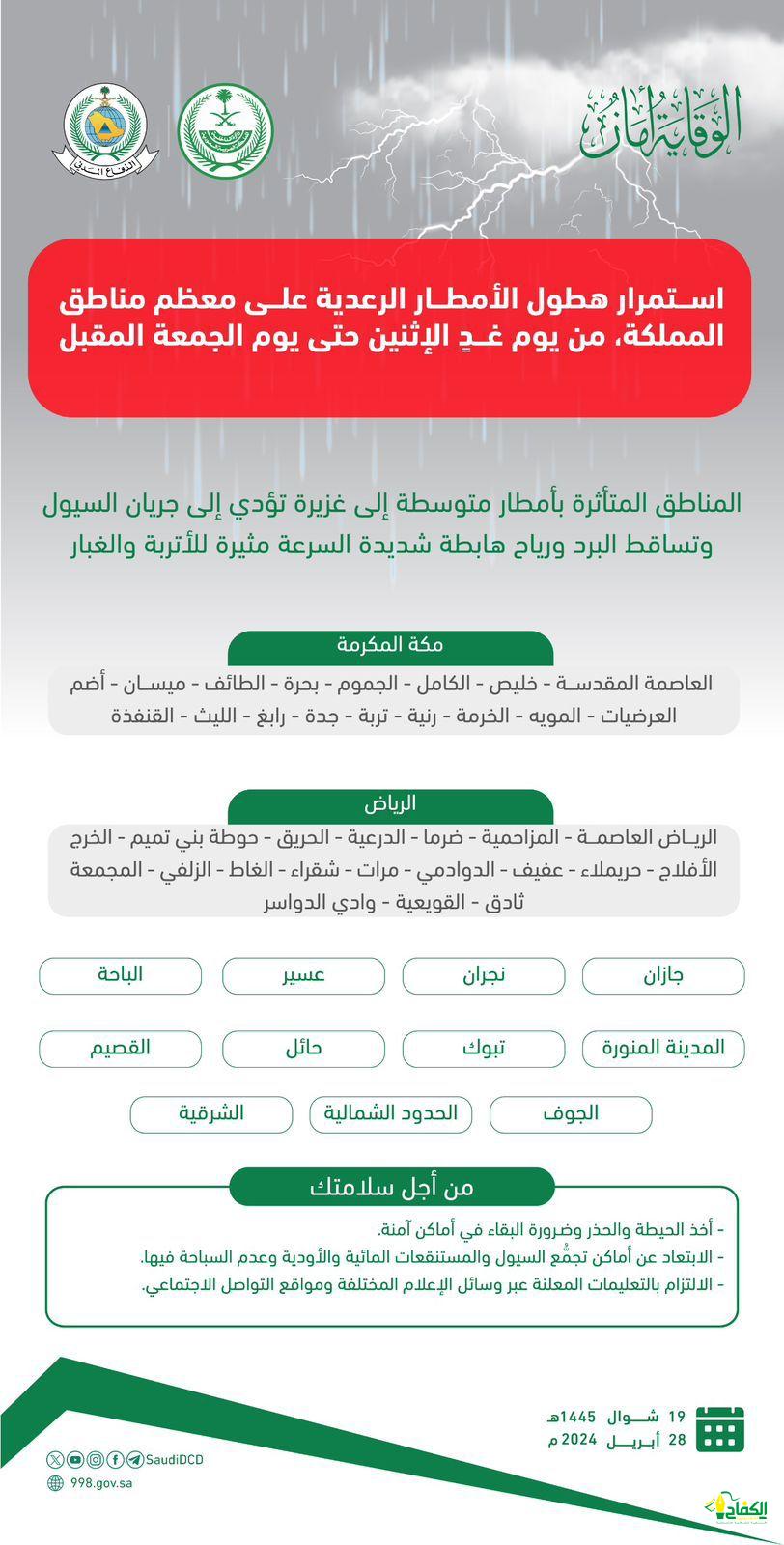 دعت المديرية العامة للدفاع المدني إلى الحيطة والحذر، وضرورة البقاء في أماكن آمنة والابتعاد عن أماكن تجمُّع السيول والمسـتنقعات المائية والأودية، وعدم السباحة فيها كونها أماكن غير مناسبة لذلك وتشكل خطورة، والالتزام بالتعليمات المعلنة عبر وسائل الإعلام المختلفة ومواقع التواصل الاجتماعي، وذلك من استمرار هطول الأمطار الرعدية على معظم مناطق المملكة، من يوم غدٍ الإثنين حتى يوم الجمعة المقبل.