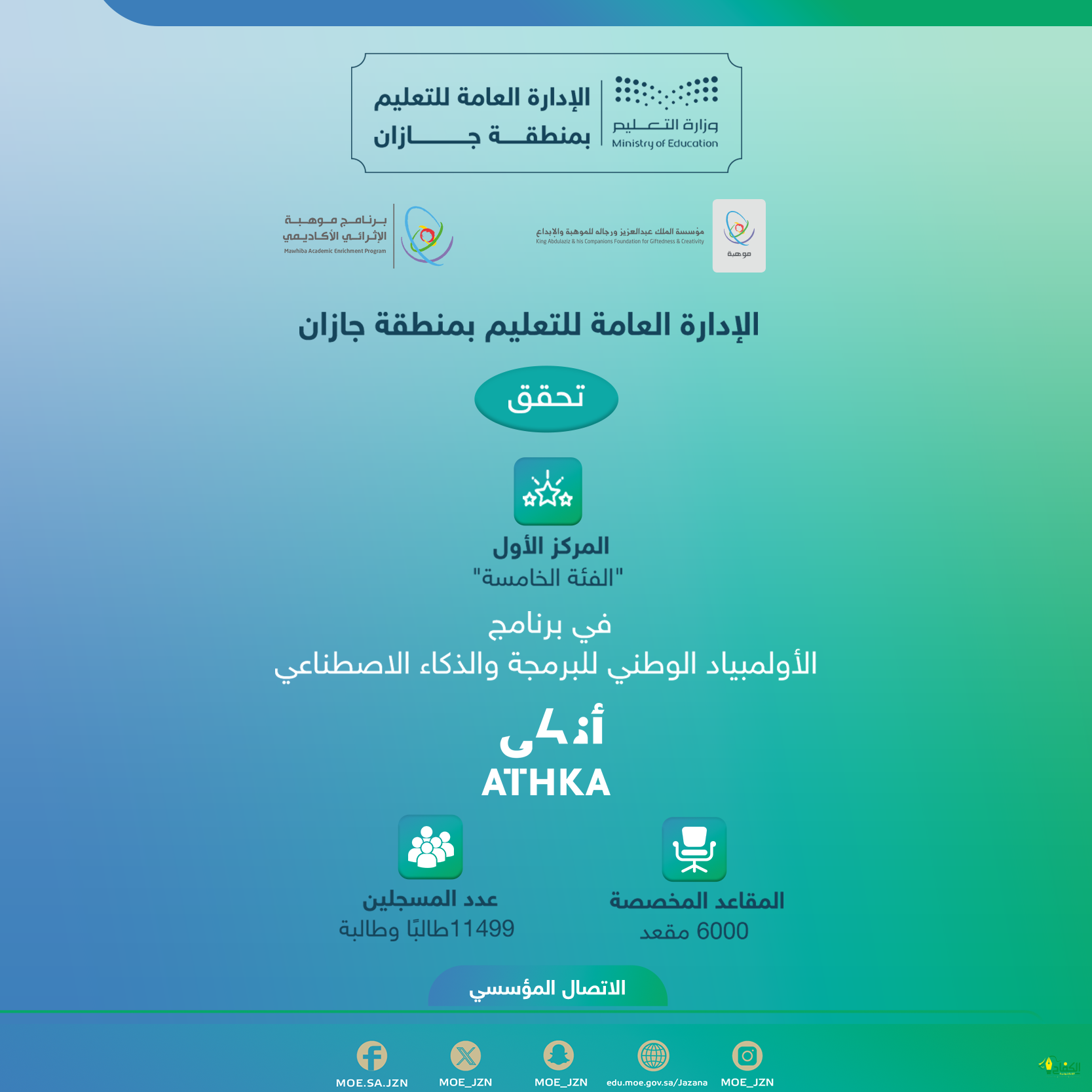حققت الإدارة العامة للتعليم بمنطقة جازان المركز الأول “الفئة الخامسة” للمناطق الأعلى تسجيلاً على مستوى المملكة في برنامج الأولمبياد الوطني للبرمجة والذكاء الاصطناعي “أذكى” الذي نظمته الهيئة السعودية للبيانات والذكاء الاصطناعي “سدايا” بالشراكة مع مؤسسة الملك عبدالعزيز ورجاله للموهبة والإبداع “موهبة” ووزارة التعليم.