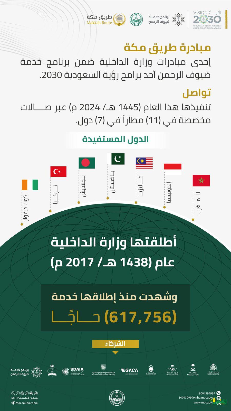 تواصل وزارة الداخلية تنفيذ مبادرة «طريق مكة» ضمن برنامج خدمة ضيوف الرحمن أحد برامج رؤية السعودية 2030، للعام السادس، وذلك عبر صالات مخصصة في (11) مطاراً في (7) دول هي المغرب، وإندونيسيا، وماليزيا، وباكستان، وبنجلاديش، وتركيا، وكوت ديفوار.