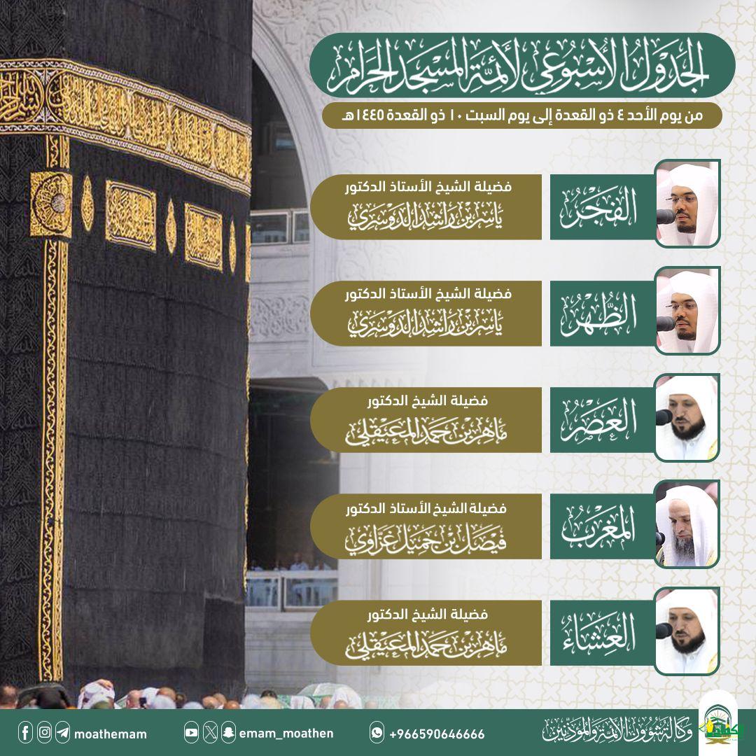 اعتباراً من يوم الأحد 4 ذو القعدة إلى يوم السبت 10 ذو القعدة 1445هـ في المسجد الحرام يؤم المصلين في صلاتي الفجر والظهر فضيلة الشيخ الاستاذ الدكتور ياسر الدوسري وصلاة العصر فضيلة الشيخ الدكتور ماهر المعيقلي وصلاة المغرب.
