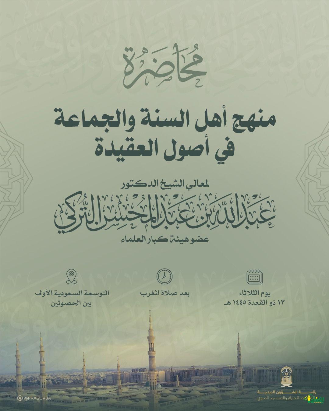 تنظم رئاسة الشؤون الدينية بالمسجد الحرام والمسجد النبوي محاضرة لمعالي الشيخ الدكتور عبدالله بن عبدالمحسن التركي – الأمين العام لرابطة العالم الإسلامي (سابقا) المحاضرة بعنوان (منهج أهل السنة والجماعة في أصول العقيدة) وتقام المحاضرة مساء يوم غدٍ الثلاثاء الثالث عشر من شهر ذو القعدة الحالي 1445هـ – عقب صلاة المغرب – في التوسعة السعودية الأولى بين الحصوتين.