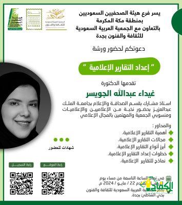 ينظم فرع هيئة الصحفيين السعوديين بمنطقة مكة المكرمة بالتعاون مع الجمعية العربية السعودية للثقافة والفنون بجدة ورشة ” إعداد التقارير الإعلامية ” في تمام الساعة التاسعة من مساء يوم غد الأربعاء 22 / مايو / 2024 م.