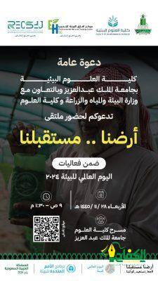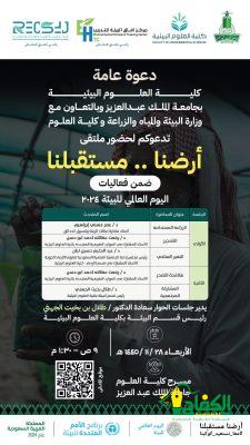وستشارك الوزارة في ندوة علمية سيتطرق لها المحاضرين عن أهمية البيئة والمحافظة عليها في جامعة الملك عبدالعزيز بجدة، وسيتم التركيز على استعادة الأراضي ومكافحة التصحر وبناء القدرة على التكيف مع الجفاف.