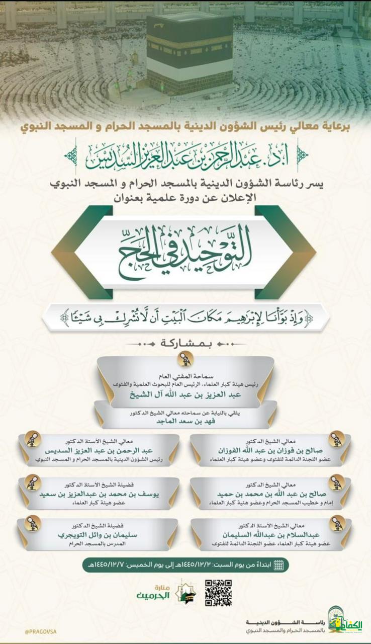 أعلنت رئاسة الشؤون الدينية بالمسجد الحرام والمسجد النبوي عن إقامة دورة علمية كبرى في رحاب المسجد الحرام في اطار خطتها في موسم حج ١٤٤٥هـ، لمدة اسبوع ؛ اعتبارا من غدا السبت حتى يوم الخميس القادم بعنوان “التوحيد في الحج”؛ بمشاركة سماحة مفتي عام المملكة، الشيخ: عبدالعزيز بن عبدالله آل الشيخ، رئيس هيئة كبار العلماء، والرئيس العام للبحوث العلمية والإفتاء؛ وبرعاية كريمة من معالي الشيخ الدكتور: عبدالرحمن السديس، رئيس الشؤون الدينية بالمسجد الحرام والمسجد النبوي.. وسيشارك في الندوة معالي الشيخ الدكتور: صالح بن فوزان الفوزان، عضو اللجنة الدائمة للفتوى، وعضو هيئة كبار العلماء، ومعالي الشيخ الدكتور: صالح بن عبدالله بن حميد، إمام وخطيب المسجد الحرام، وعضو هيئة كبار العلماء، ومعالي الشيخ الأستاذ الدكتور: عبدالرحمن بن عبدالعزيز السديس، رئيس الشؤون الدينية بالمسجد الحرام والمسجد النبوي، وإمام وخطيب المسجد الحرام.