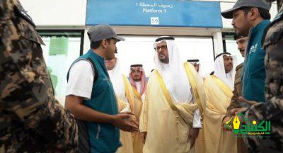 واستقل سموه قطار المشاعر من مركز التشغيل والتحكم إلى محطة (عرفات 1)، واطلع على جاهزية المحطة لاستقبال ضيوف الرحمن والخدمات المقدمة بها.