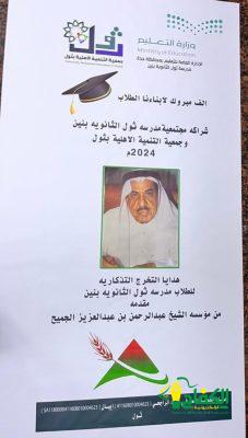 حيث كرمت مؤسسة وقف الشيخ عبدالرحمن بن عبدالعزيز الجميح رحمه الله بتقديم كافة الهدايا التذكارية للطلاب والطالبات المتخرجين وذلك بحضور عدد كبير من أهالي محافظة ثول من أولياء الأمور والمشرفين التربويين ومدراء ومديرات المدارس وكافة الطلاب والطالبات حيث تخلل حفلات التخرج العديد من الفقرات الشيقة والأهازيج الوطنية والقصائد الشعرية المعبرة والتي نالت إعجاب وإستحسان الجميع.