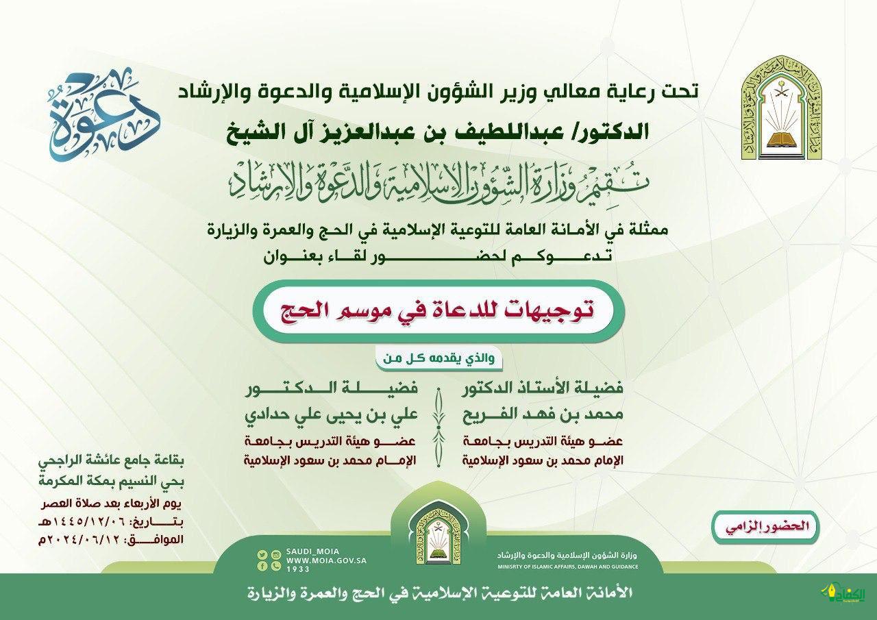 تحت رعاية معالي وزير الشؤون الإسلامية والدعوة والإرشاد الشيخ الدكتور عبداللطيف بن عبدالعزيز آل الشيخ، تنظم الوزارة ممثلة بالأمانة العامة للتوعية الإسلامية في الحج والعمرة والزيارة، اليوم الأربعاء السادس من شهر ذي الحجة الجاري، ندوة علمية بعنوان: (توجيهات للدعاة في موسم الحج) يقدمها عضوي هيئة التدريس بجامعة الإمام محمد بن سعود الإسلامية الدكتور محمد بن فهد الفريح، والدكتور علي بن يحيى حدادي.