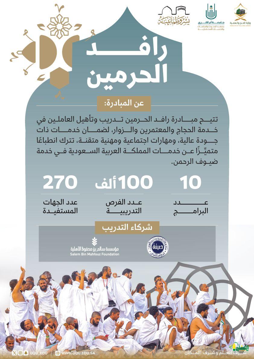 من خلال 100,000 فرصة تدريبية، و 270 جهة مستفيدة؛ أطلق مركز ترخيص وتأهيل العاملين بقطاع خدمة ضيوف الرحمن في وزارة الحج والعمرة بالشراكة مع معهد البحوث والدراسات والخدمات الاستشارية في جامعة أم القرى مبادرة رافد الحرمين؛ للارتقاء بالخدمات المقدمة لضيوف الرحمن خلال موسم #حج_1445هـ.