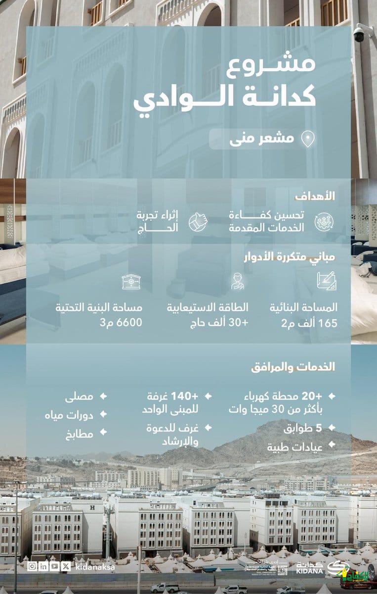 من أبرز مشاريع الإسكان العمرانية التي نفذتها الهيئة الملكية لمدينة مكة المكرمة والمشاعر المقدسة ممثلة في كدانه للتنمية والتطوير التابعة للهيئة والتي يستفاد منها في حج هذا العام لأول مرة و أطلق عليه مسمى مشروع كدانه الوادي وهو عبارة عن عمائر لسكن الحجاج ويهدف المشروع لزيادة تحسين الخدمات المقدمة لضيوف الرحمن و زيادة الطاقة الإستيعابية لإسكان الحجاج لمشعر منى وتتكون العمائر من مبان متكررة بخمسة أدوار لكل مبنى من المباني الخمسة على مساحة بنائية تقدر ب١٦٥ ألف متر مربع بينما تبلغ مساحة البنية التحتية ٦٦٠٠ متر مربع وعدد الغرف ١٤٠ غرفة لمل مبنى وتبلغ الطاقة الإستيعابية لهذه العمائر حوالي ٣٠ ألف حاج وتستمل على العديد من الخدمات والمرافق وهي ٢٠ محطة كهربائية بأكثر من ٣٠ميجا وات و عيادات طبية وغرف لمكاتب الدعوة والإرشاد ومصلى ومطابخ علما بأن العمائر تتكون من خمسة طوابق.