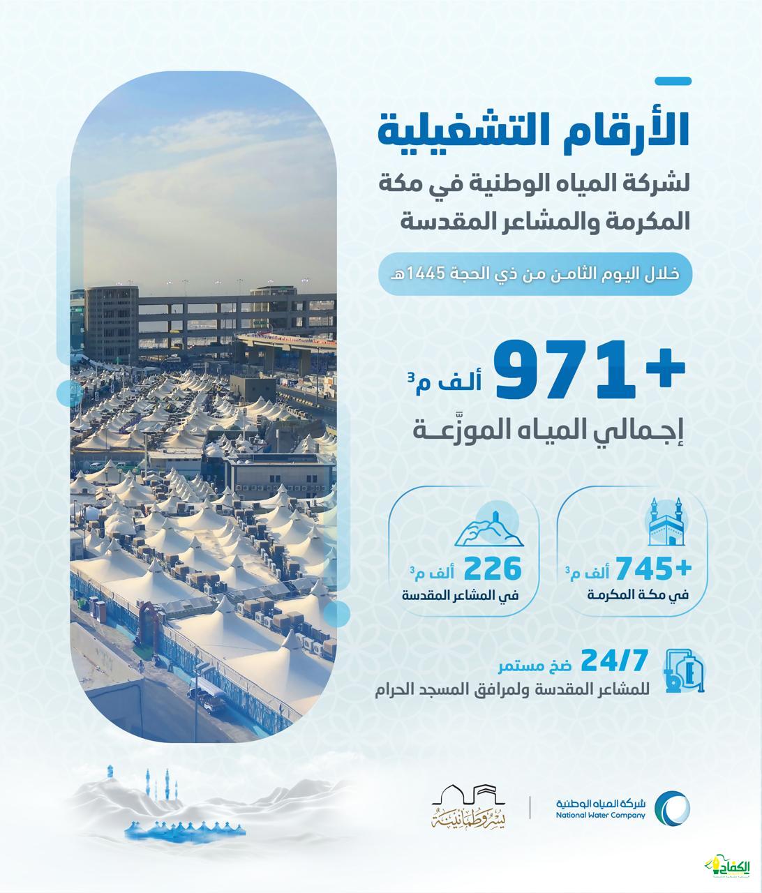 أكدت المياه الوطنية أن كمية المياه التي وزعتها عبر شبكات المياه في يوم التروية في مكة المكرمة و المشاعر المقدسة تجاوزت (971) ألف متر مكعب، وذلك لخدمة حجاج بيت الله الحرام.
