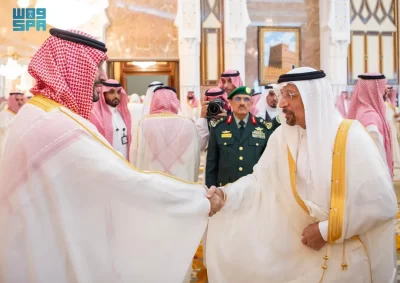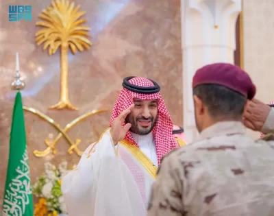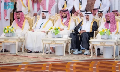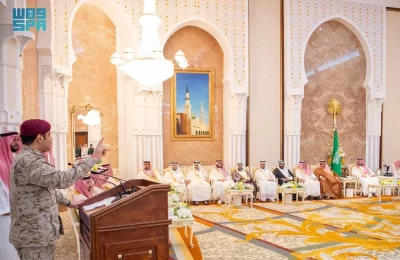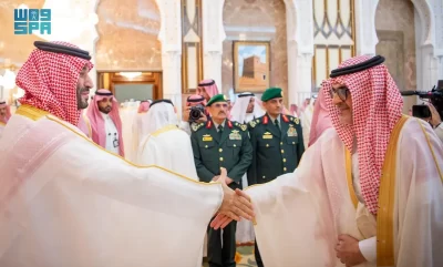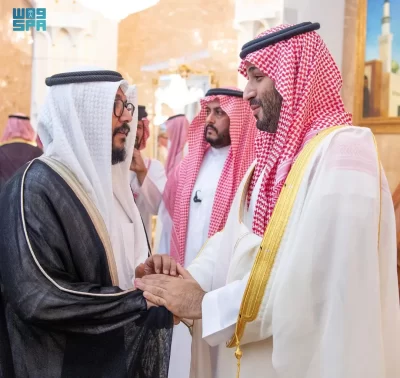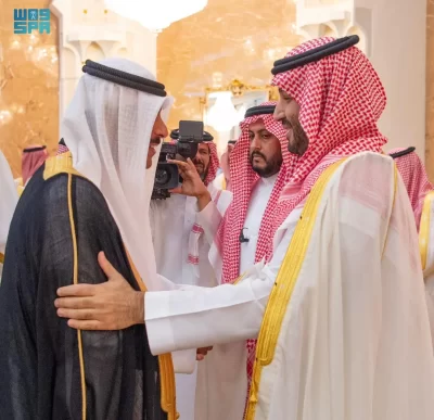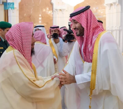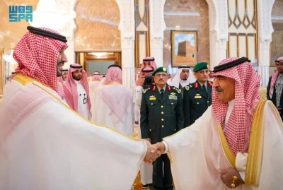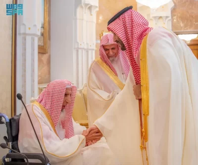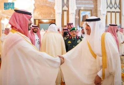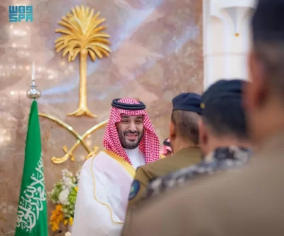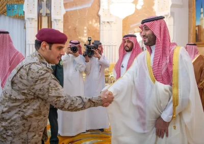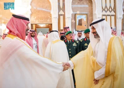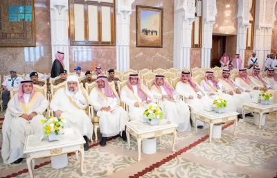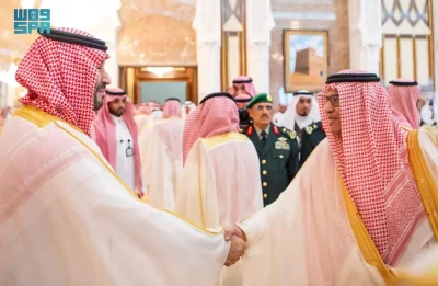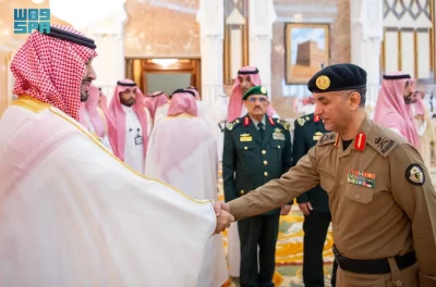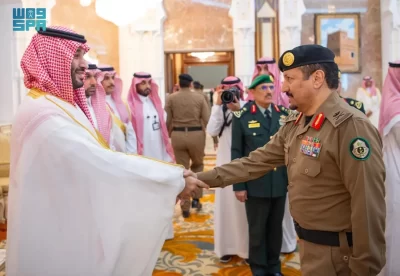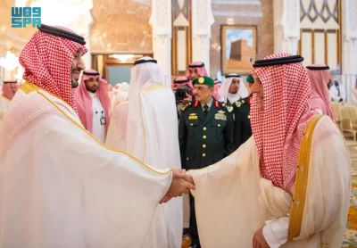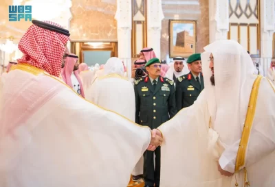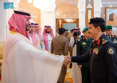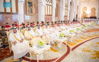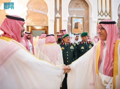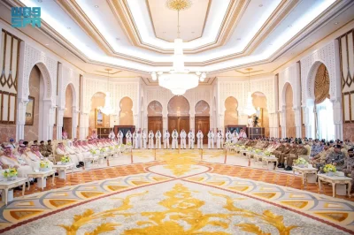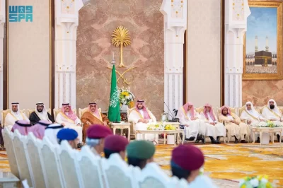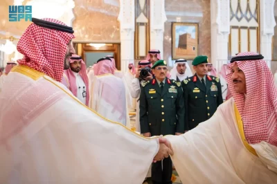نيابة عن خادم الحرمين الشريفين الملك سلمان بن عبدالعزيز آل سعود القائد الأعلى لكافة القوات العسكرية ـ حفظه الله ـ، استقبل صاحب السمو الملكي الأمير محمد بن سلمان بن عبدالعزيز آل سعود ولي العهد رئيس مجلس الوزراء، في الديوان الملكي بقصر منى، اليوم، أصحاب السمو الملكي الأمراء، وسماحة مفتي عام المملكة، وأصحاب الفضيلة العلماء والمشايخ، وكبار المدعوين من دول مجلس التعاون لدول الخليج العربية، وأصحاب المعالي الوزراء، وقادة القطاعات العسكرية المشاركة في حج هذا العام، وقادة الأسرة الكشفية في المملكة المشاركة في الحج.