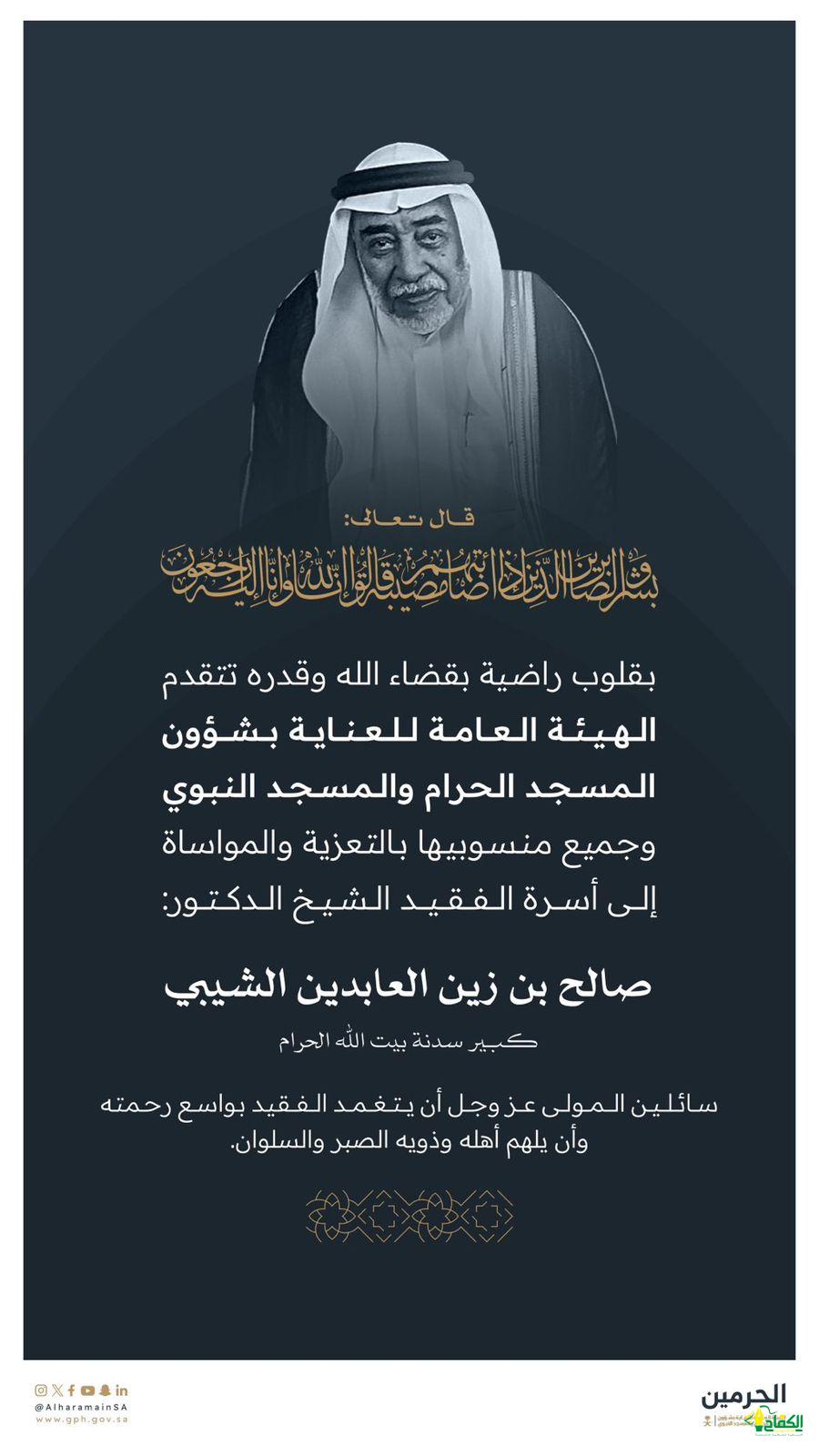 بقلوب راضية بقضاء الله وقدره تتقدم الهيئة العامة للعناية بشؤون المسجد الحرام والمسجد النبوي وجميع منسوبيها بالتعزية والمواساة إلى أسرة الفقيد: الشيخ الدكتور صالح بن زين العابدين الشيبي كبير سدنة بيت الله الحرام، سائلين المولى القدير أن يتغمد الفقيد بواسع رحمته وأن يسكنه فسيح جناته وأن يلهم أهله وذويه ومحبيه الصبر والسلوان – وإنا لله وإنا إليه راجعون.