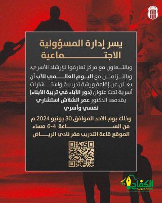 بمناسبة يوم الأب العالمي يُقيم مركز تعارفوا للإرشاد الأسري وبالتعاون مع نادي الرياض السعودي ممثلاً بإدارة المسؤولية المجتمعية ، ورشة تدريبيه عن دور الأباء في تربية الأبناء وذلك يوم الاحد الموافق يونيو ٢٠٢٤م بمقر نادي الرياض من تقديم أ. د. عمر الشلاش أستاذ علم النفس المشارك بجامعة شقراء والإستشاري النفسي والأسري بمركز تعارفوا للإرشاد الأسري.