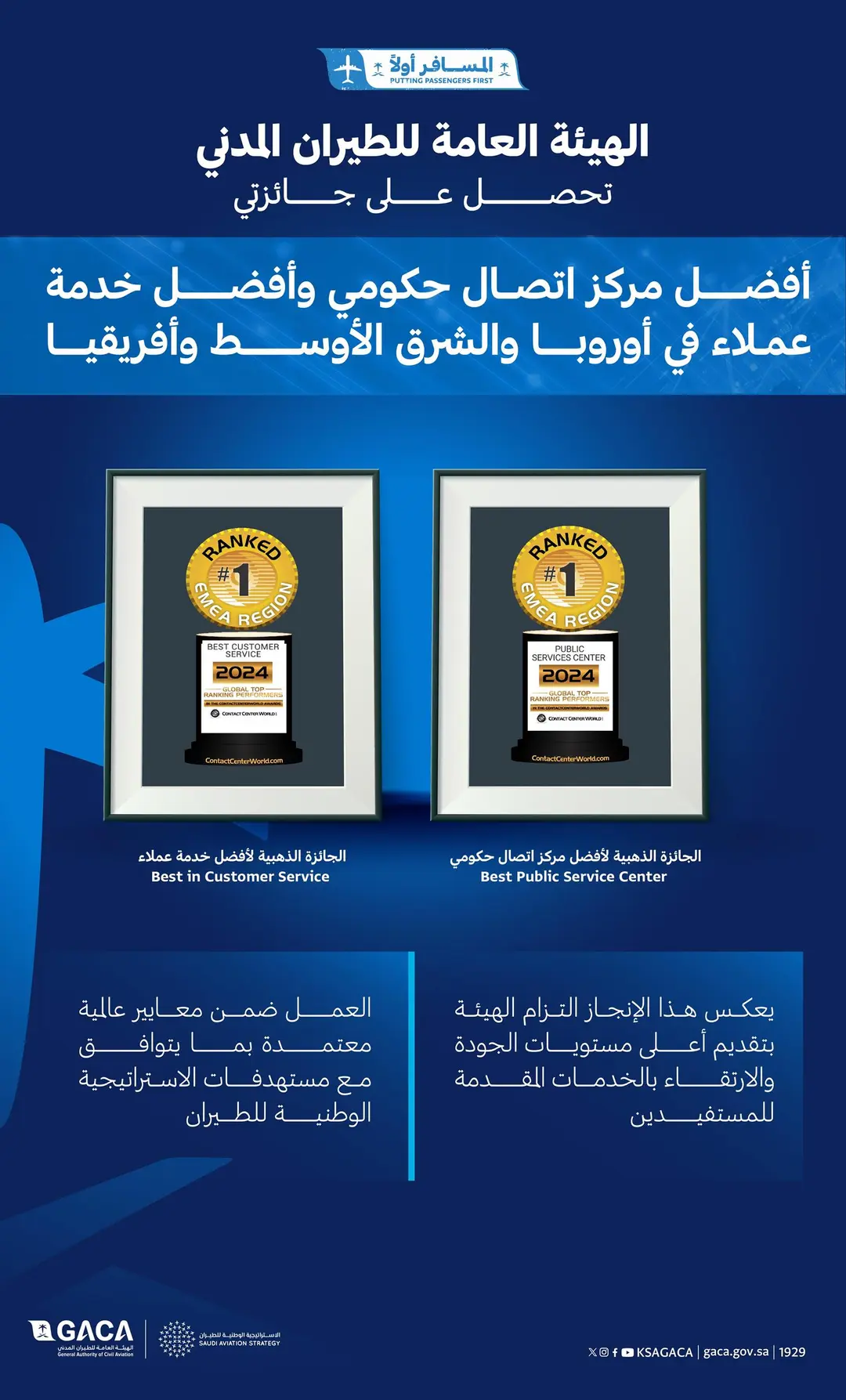 حصدت الهيئة العامة للطيران المدني ممثلة بمركز الاتصال بقطاع الجودة وتجربة المسافر بجائزتين ذهبيتين كأفضل خدمة عملاء وأفضل مركز اتصال حكومي في أوروبا ومنطقة الشرق الأوسط وأفريقيا، وذلك خلال مشاركتها في المؤتمر السنوي لمركز الاتصال العالمي (Contact Center World) الذي أُقيم بمدينة أمستردام بهولندا.