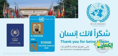 تكللت المسيرة الإنسانية للدكتور الإماراتي عادل المرزوقي الإنسانية بإطلاقه لمبادرة مجتمع جنسيتي إنسان، بدعم ورعاية ساميه من سمو الشيخة مريم بنت محمد آل مكتوم الرئيس الفخري الأعلى للإدارة العليا وحصل الدكتور عادل المرزوقي مؤخرا على عضوية الأمم المتحدة ممثلا للإمارات العربية المتحدة والعرب قاطبة.