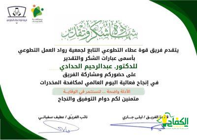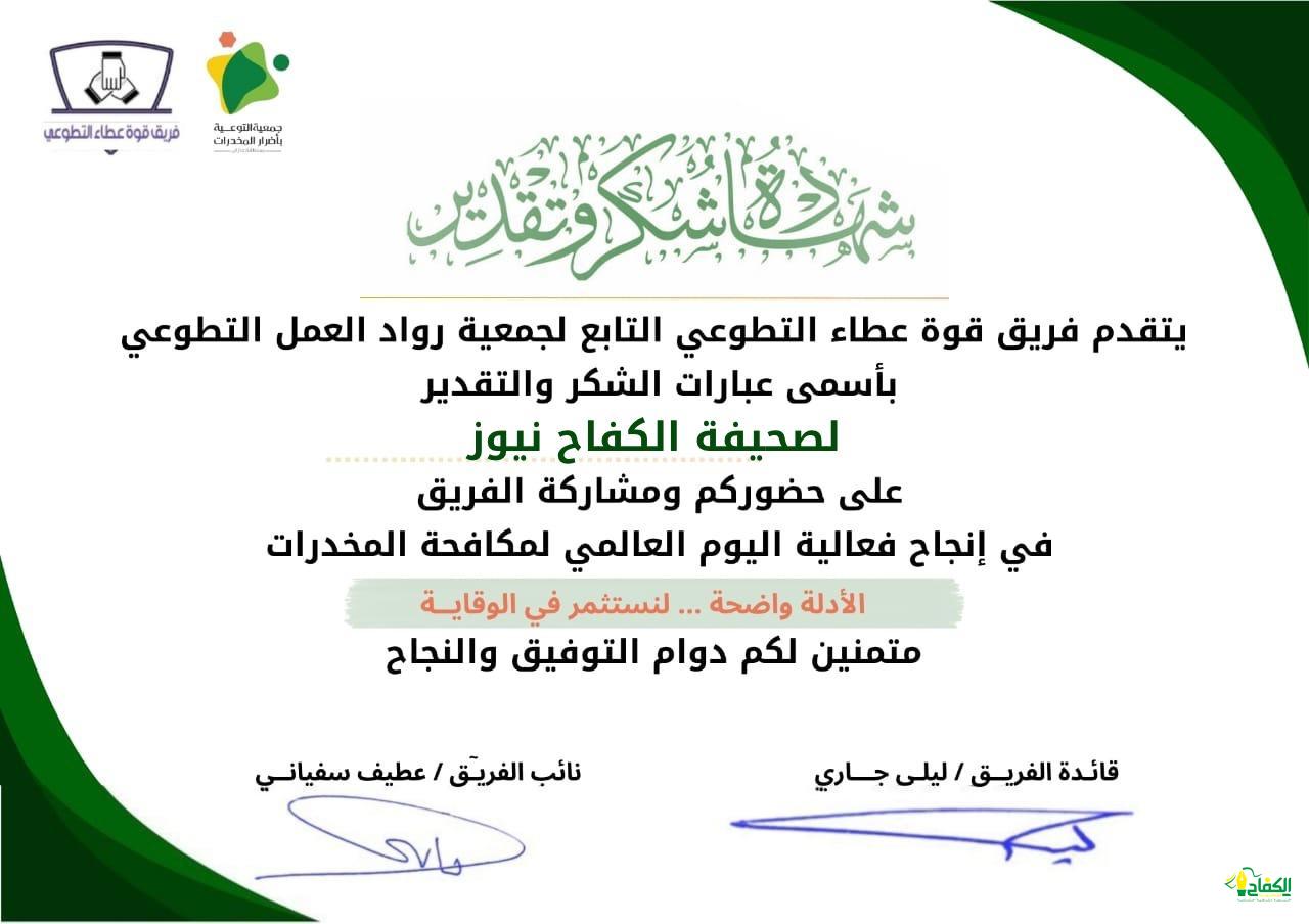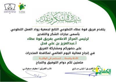 فريق قوة عطاء التطوعي التابع لجمعية رواد العمل التطوعي بمنطقة جازان – يكرم – صحيفة الكفاح نيوز ورئيس التحرير الدكتور – عبدالرحيم الحدادي ومحرر الصحيفة في جازان – عبدالعزيز قحل وذلك للمشاركة في إنجاح فعاليات اليوم العالمي لمكافحة المخدرات.