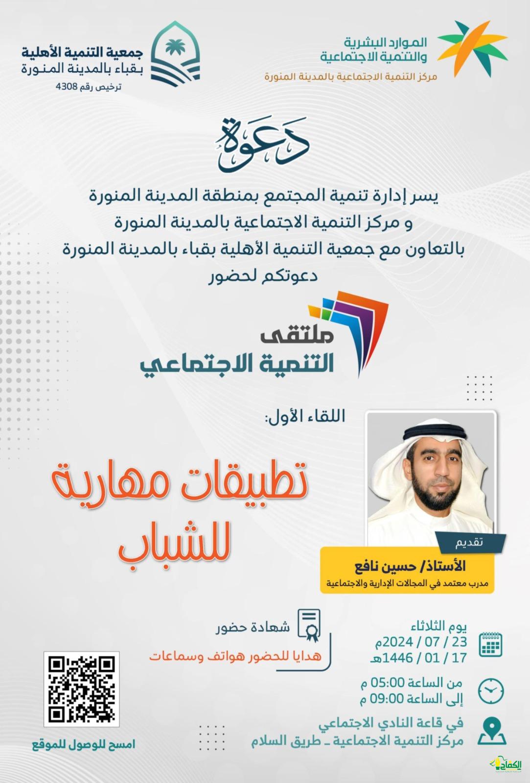 ينظم مركز التنمية الإجتماعية بالمدينة المنورة مساء اليوم الثلاثاء ملتقى التنمية الإجتماعي الأول بعنوان – تطبيقات مهارية للشباب – من الساعة الخامسة مساء إلى الساعة التاسعة مساء تقديم الأستاذ حسين نافع – مدرب معتمد في المجلات الإدارية والإجتماعية – وذلك في قاعة النادي الإجتماعي مركز التنمية الإجتماعي طريق السلام.