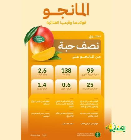 استعرضت وزارة البيئة والمياه والزراعة، الفوائد الصحية، والقيمة الغذائية لفاكهة المانجو، التي تنتج المملكة منها أكثر من (89) ألف طن سنويًا، في عددٍ من المناطق، مبينة أن كل نصف حبة من المانجو يحتوي على (99) سعرة حرارية، و(138) جرام ماء، و(2,6) جرام ألياف، و(25) جرام كربوهيدرات، و(0,6) جرام دهون، و(1,4) جرام بروتين.