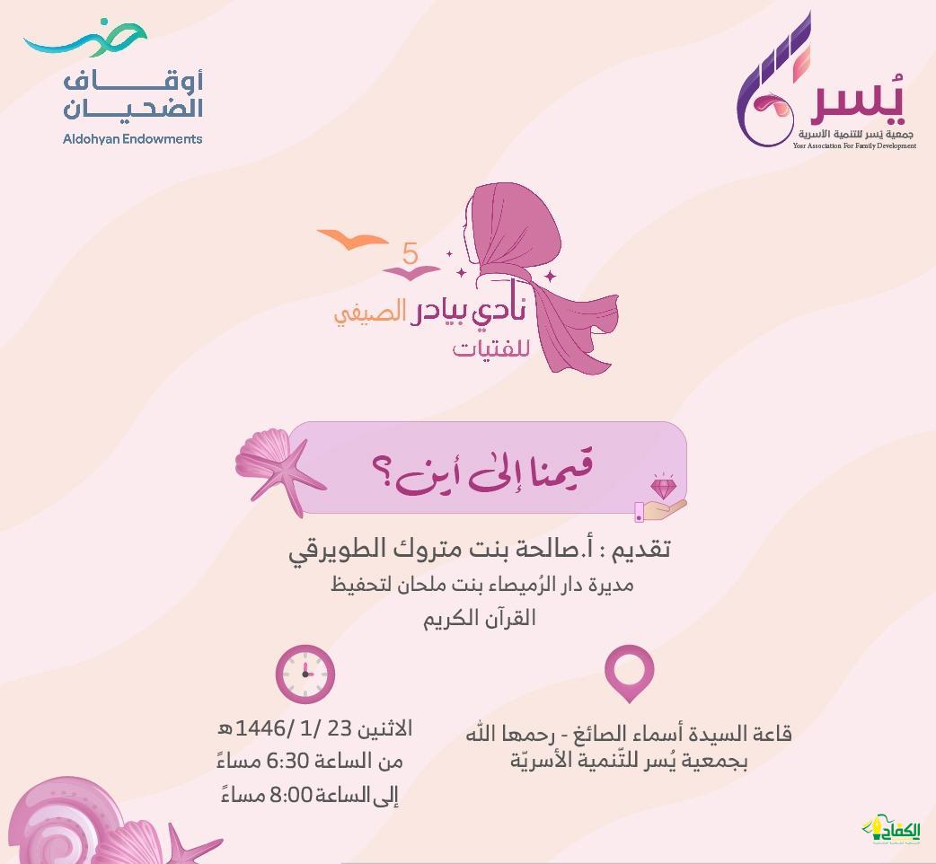 نظمت لقاء بعنوان : (قيمنا إلى أين؟) مع المدربة المتألقة الأستاذة صالحة بنت متروك الطويرقي “مديرة دار الرميصاء بنت ملحان لتحفيظ القرآن الكريم “.