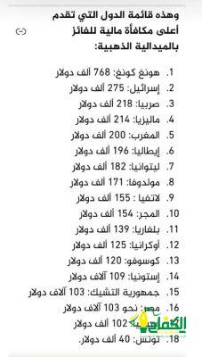 هل تعلم أن اللجنة الاولمبية الدولية لا تمنح جوائز مالية للفائزين بالميداليات أسوةً بكأس العالم لكرة القدم وغيرها من البطولات لكن العديد من الرياضيين الاولمبيين سوف يحصلون على مكآفات مالية كبيرة من بلدانهم في حال حصولهم على الميداليات وبحسب مجلة فوربس سوف تمنح هونغ كونغ لرياضيها 768 الف دولار مقابل كل ميدالية ذهبية و 380 الف دولار مقابل كل فضية و هي أعلى مكافأة من بين جميع الدول الاخرى المشاركة في دورة باريس وإليكم قائمة الدول وجوائزها المالية.
