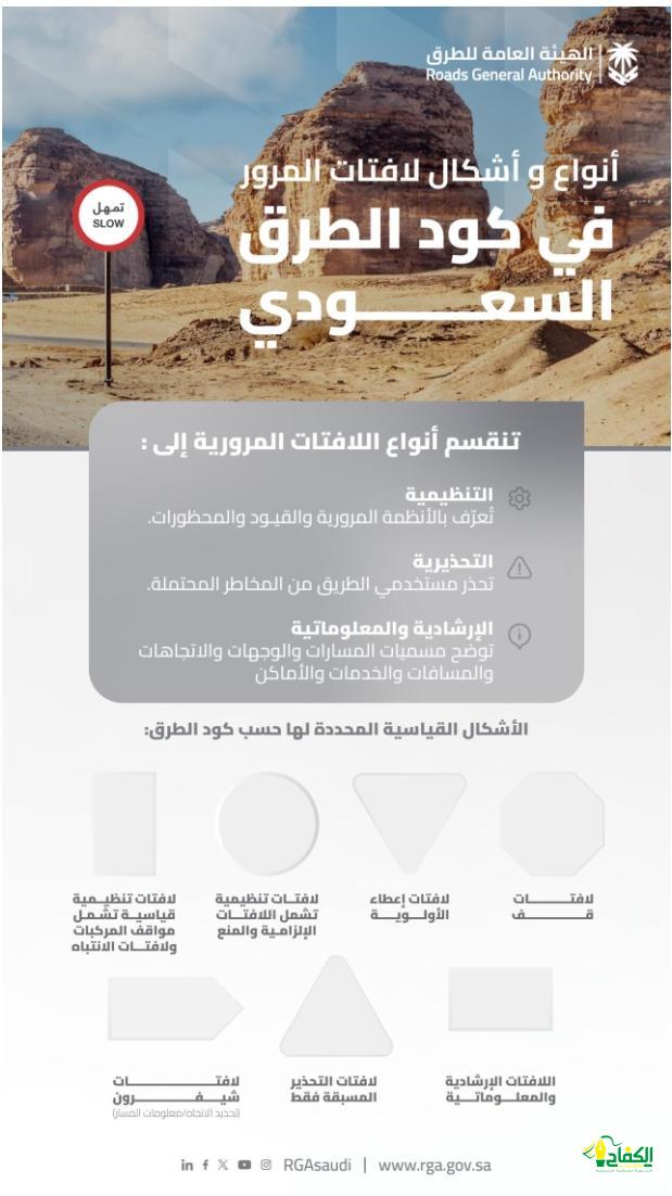 أوضحت الهيئة العامة للطرق مدلولات أنواع وأشكال لافتات المرور وفقاً لكود الطرق السعودي، مبينة أن أنواع الافتات المرور تنقسم إلى 3 أقسام، أولها التنظيمية وهي التي تعرف الأنظمة المرورية والقيود والمحظورات، وثانياً التحذيرية، وهي التي تستخدم لتحذير مستخدمي الطرق من المخاطر المحتملة، ثالثاً الإرشادية والمعلوماتية، والتي تهدف لتوضيح مسميات المسارات والوجهات والاتجاهات والمساقات والخدمات والأماكن، كما أوضحت الهيئة عدداً من الأشكال المحددة لكل نوع من لافتات المرور.