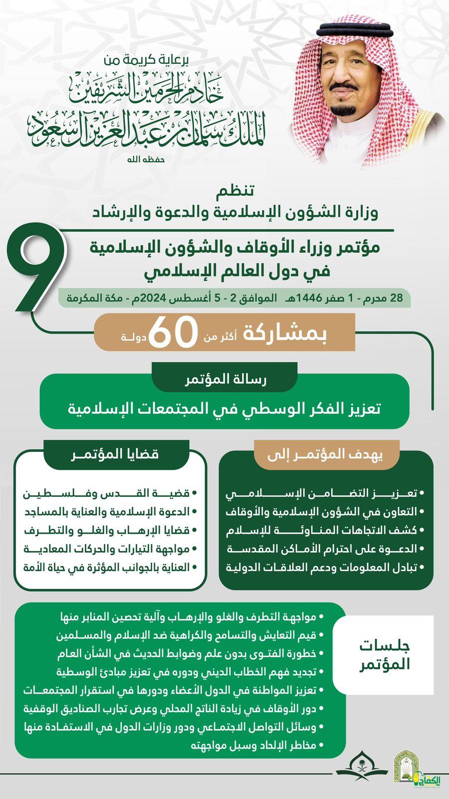 ترأس معالي وزير الشؤون الإسلامية والدعوة والإرشاد الرئيس التنفيذي لمؤتمر وزراء الأوقاف والشؤون الإسلامية بدول العالم الإسلامي الشيخ الدكتور عبداللطيف بن عبدالعزيز آل الشيخ صباح اليوم السبت الثامن والعشرين من شهر المحرم لعام 1446هـ، اجتماع المجلس التنفيذي الـ 14 لمؤتمر الأوقاف والشؤون الإسلامية في العالم الإسلامي بحضور أعضاء المجلس من الدول الأعضاء لمناقشة جدول أعمال مؤتمر وزراء الأوقاف والشؤون الإسلامية بدول العالم الإسلامي في دورته التاسعة والذي تنظمه وزارة الشؤون الإسلامية والدعوة والإرشاد برعاية كريمة من خادم الحرمين الشريفين الملك سلمان بن عبدالعزيز آل سعود- حفظه الله- على مدى يومين بَدْءًا من يوم الأحد التاسع والعشرين من شهر المحرم الجاري للعام 1446هـ بمكة المكرمة بمشاركة وزراء ومفتين ورؤساء مجالس إسلامية من 62 دولة حول العالم.