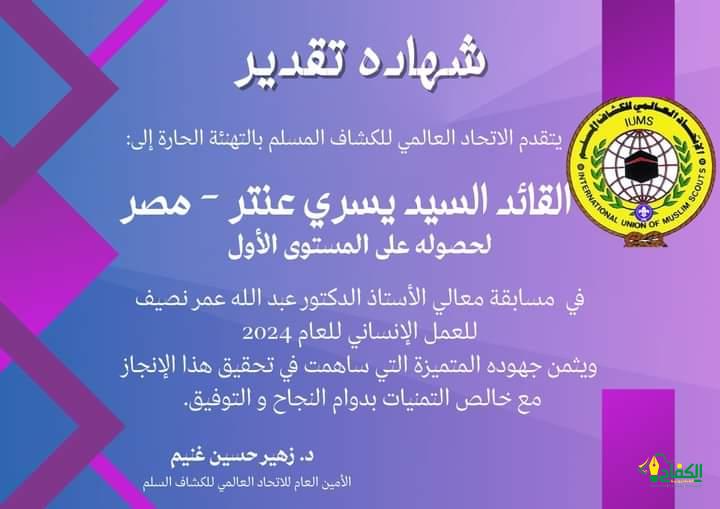 توج الإعلامي السيد عنتر بالمستوي الاول في مسابقة معالى الدكتور عبد الله عمر نصيف للعمل الإنساني لعام ٢٠٢٤ المسابقة نظمها الإتحاد العالمي للكشاف المسلم وأختار الزميل السيد عنتر الشق الإنساني لأصحاب الھمم الذين لم يستسلموا لحالتھم ومارسوا حياتهم بكل فخر واعتزاز مع الإحصاء بل تحدوا الاعاقة وحققوا مراكز مرموقة ونجاحات يشار اليھا بالبنان فضلا عن رعاية الايتام وبعض الاسر المتعففة.