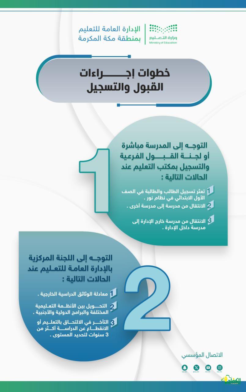 خصصت الإدارة العامة للتعليم بمنطقة مكة المكرمة 17 لجنة إشرافية لدعم ومعالجة إجراءات القبول والتسجيل وعمليات انتظام الطلاب والطالبات في مقاعدهم الدراسية منها لجنة مركزية بالإدارة و 16 لجنة فرعية بمكاتب التعليم؛