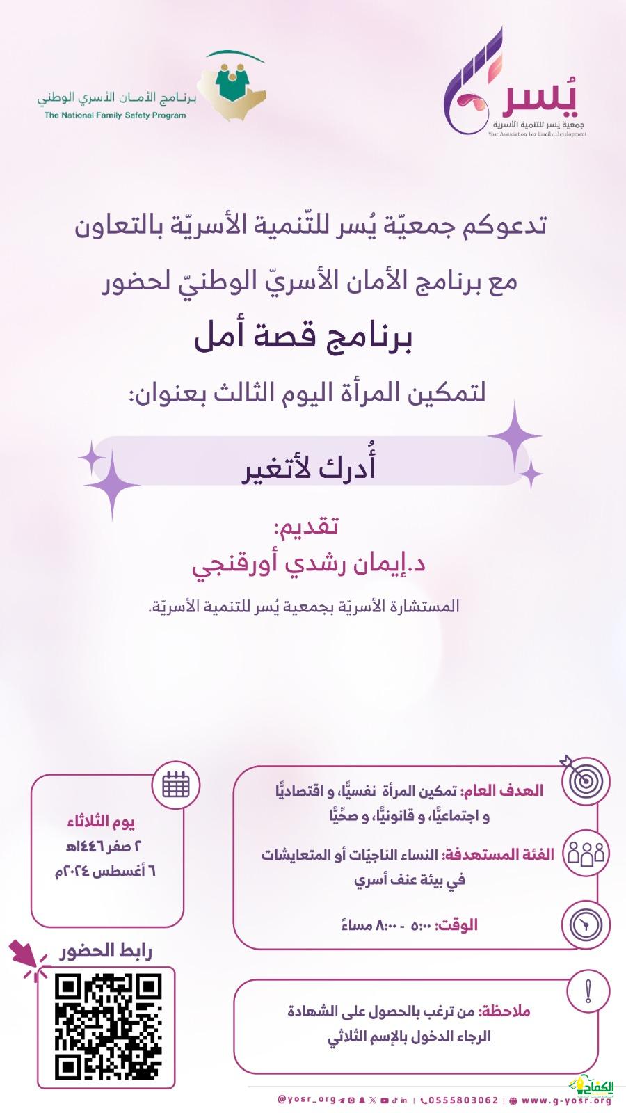 ضمن الأنشطة والبرامج والفعاليات والمبادرات التي تقوم بها جمعيّة يُسر للتّنمية الأسريّة بالتعاون مع برنامج الأمان الأسريّ الوطنيّ وضمن (مشروع قصَّة أمل) لتمكين المرأة يقام اليوم الثالث بعنوان:(أُدرك لأتغير) أوضحت ذلك الأستاذة الدكتورة هيفاء عثمان فدا – رئيسة مجلس إدارة الجمعية واشارت بأن اللقاء من تقديم الدكتورة إيمان رشدي أورقنجي الأخصائيّة الاجتماعيّة بجامعة أم القرى، والمستشارة الأسريّة بجمعية يُسر للتنمية الأسريّة بمكة المكرمة ويقام اللقاء اليوم الثلاثاء ٢ صفر ١٤٤٦ الموافق ٦ أغسطس ٢٠٢٤م.