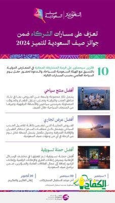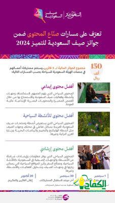 وتضمّن إعلان جوائز صيف السعودية للتميز 2024 فئتين للجائزة، الأولى هي للمبدعين والموهوبين من صناع المحتوى؛ وتتضمن ثلاث مسارات؛ المسار الأول للمحتوى الأكثر إبداعاً، والذي يسلط الضوء على برنامج صيف السعودية لهذا العام ووجهاته السياحية السبعة “عسير، الباحة، الطائف، البحر الأحمر، الرياض، جدة، العلا”، المسار الثاني للمحتوى المخصص للأنشطة السياحية في وجهات الصيف، مثل: التخييم الجبلي، الهايكنج، الرياضات البحرية، زيارة القرى التراثية، الكشتة، وغيرها، المسار الثالث للمحتوى الإرشادي الأكثر شمولاً والذي يقدم معلومات وافية عن برنامج صيف السعودية أو ما يتضمنه من وجهات وأنشطة وفعاليات لهذا العام، ويحصل الفائزين على جائزة مالية تقدّر بمبلغ 50 ألف ريال سعودي لكل مسار، كما سيتم الإعلان عن الفائزين عبر منصات الهيئة السعودية للسياحة.