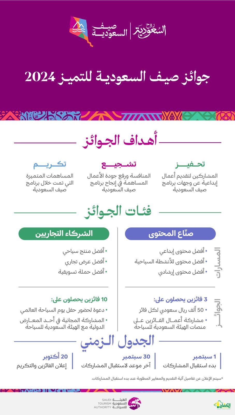 أعلنت الهيئة السعودية للسياحة اليوم عن تفاصيل “جوائز صيف السعودية للتميز 2024″، والتي أطلقها معالي وزير السياحة، رئيس مجلس إدارة الهيئة السعودية للسياحة، الأستاذ أحمد بن عقيل الخطيب في ورشة عمل جمعت منظومة السياحة السعودية مع الشركاء من القطاع الخاص في شهر مايو الماضي. ويأتي ذلك في إطار جهود الهيئة لتعزيز المحتوى الإعلامي والتسويقي، وتحفيز صناع المحتوى والشركاء من القطاع الخاص، بهدف إبراز دورهم في إنجاح وإثراء برنامج صيف السعودية 2024.