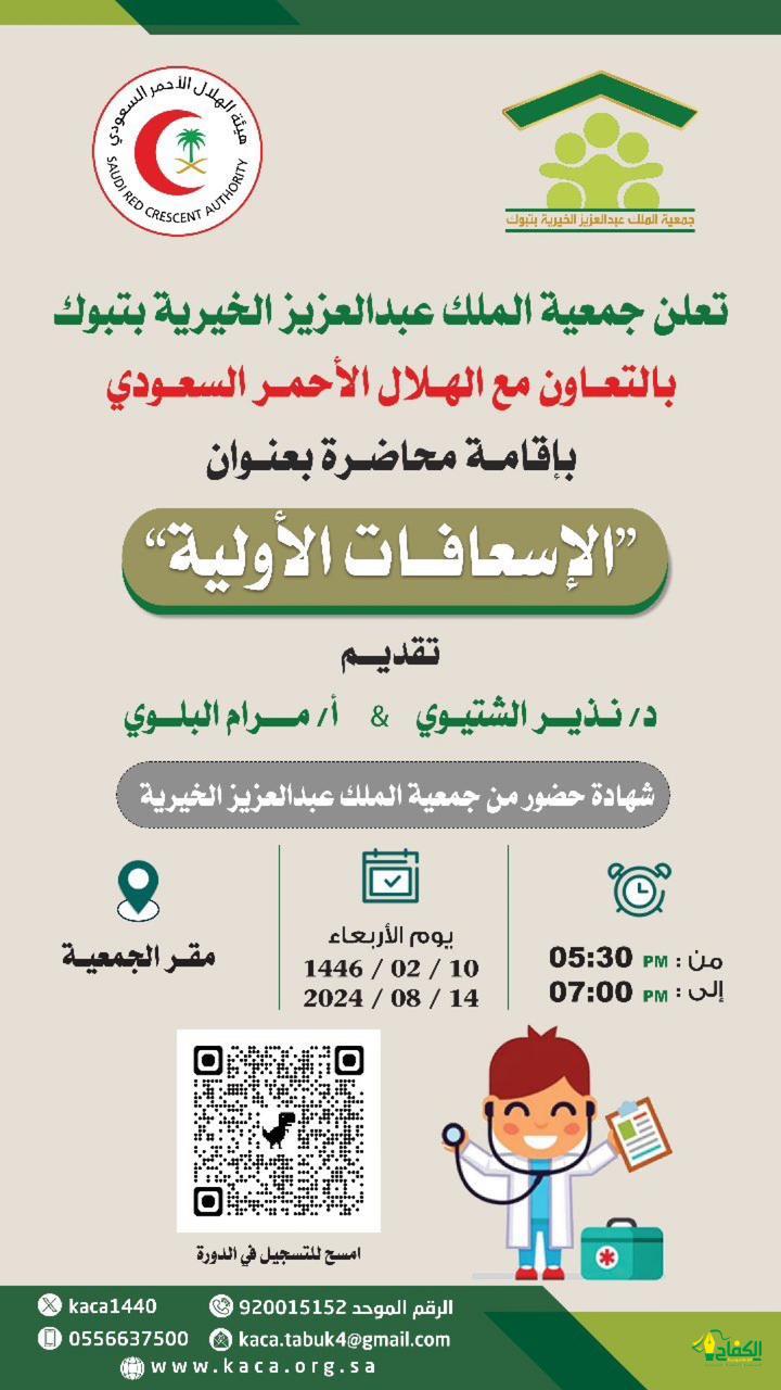 بالتعاون مع هيئة الهلال الأحمر السعودي تُقيم جمعية الملك عبد العزيز بمنطقة تبوك محاضرة توعوية عن “الإسعافات الأولية” وذلك يوم الأربعاء القادم بمقر الجمعية، كما سوف يتم توزيع شهادات للحضور.