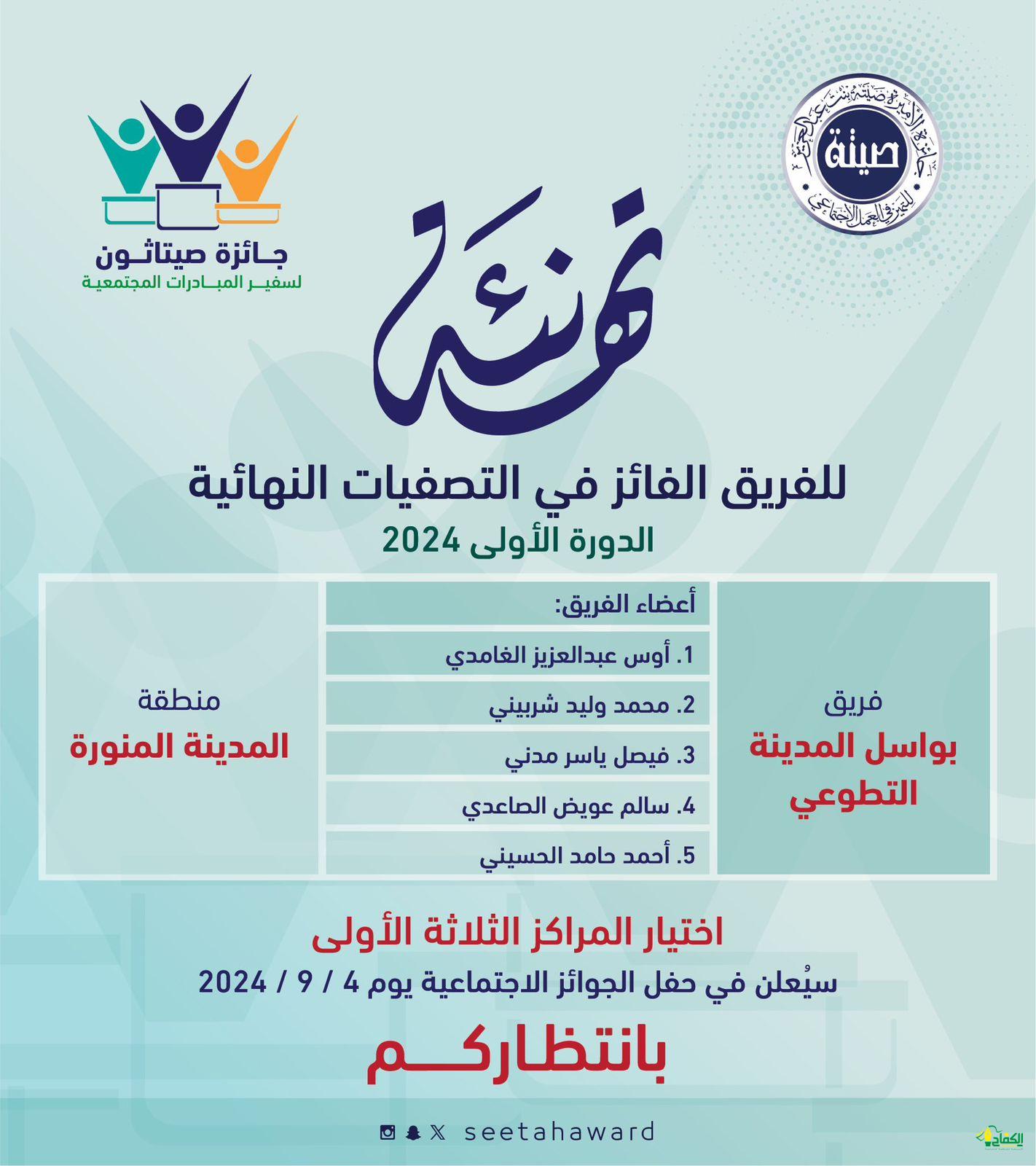 حققت مبادرة القراءة المتجولة المركز الأول على مستوى الإدارة العامة للتعليم بمنطقة المدينة المنورة ضمن البرنامج الوطني لتعزيز المبادرات المجتمعية ( هاكاثون) أحدى مبادرات جائزة الأميرة صيتة للتميز في العمل الاجتماعي ؛ فكره وتنفيذ فريق بواسل المدينة التطوعي بثانوية الأمير عبدالمحسن بن عبدالعزيز.