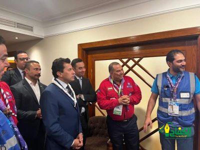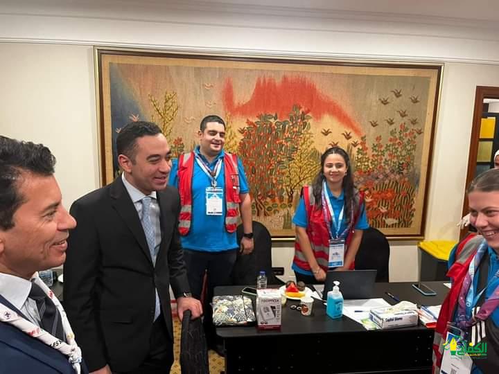 واطلع وزير الشباب علي النظام المميكن لمتابعة الجلسات وإدارة الأزمات والخاطر داخل الغرفة، كما تفقد المركز الطبي المقام بدعم من الهلال الأحمر المصري، وآليات التنسيق مع الجهات الطبية المعنية.