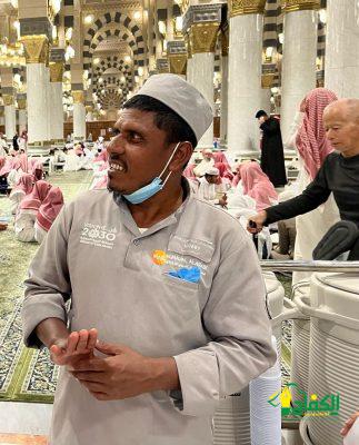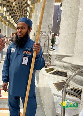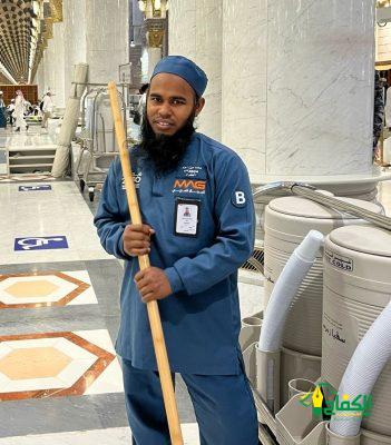 العامل على أعمال النظافة بالمسجد النبوي “محمد اسلام” بدأ حديثه بشكر الله عز وجل ان اصطفاه وشرفه بالعمل على نظافة المسجد النبوي والمشاركة في جودة أعمال التطهير وفق أعلى المعايير، مؤكداً أن عمله في المسجد النبوي بمثابة فخر واعتزاز له كمسلم اتيحت له الفرصة العمل في المسجد النبوي حيث يبذل قصارى جهده يومياً ليتميز هو وفريق النظافة الميداني في جعل بيئة المسجد النبوي نظيفة وصحية.