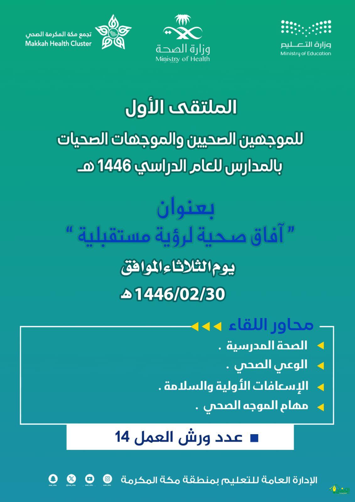 نفذت الإدارة العامة للتعليم بمنطقة مكة المكرمة ” الشؤون التعليمية – تنمية القدرات ؛ الشؤون الصحية المدرسية – ” ملتقى ( آفاق صحية لرؤية مستقبلية”) للموجهين الصحيين والموجهات الصحيات في مدارس تعليم مكة، وذلك عبر برنامج” التميز ” ويأتي ذلك ضمن التعاون الإيجابي المشترك بين الإدارة العامة للتعليم بمنطقة مكة المكرمة، وفرع وزارة الصحة بمنطقة مكة المكرمة ، وتجمع مكة الصحي.
