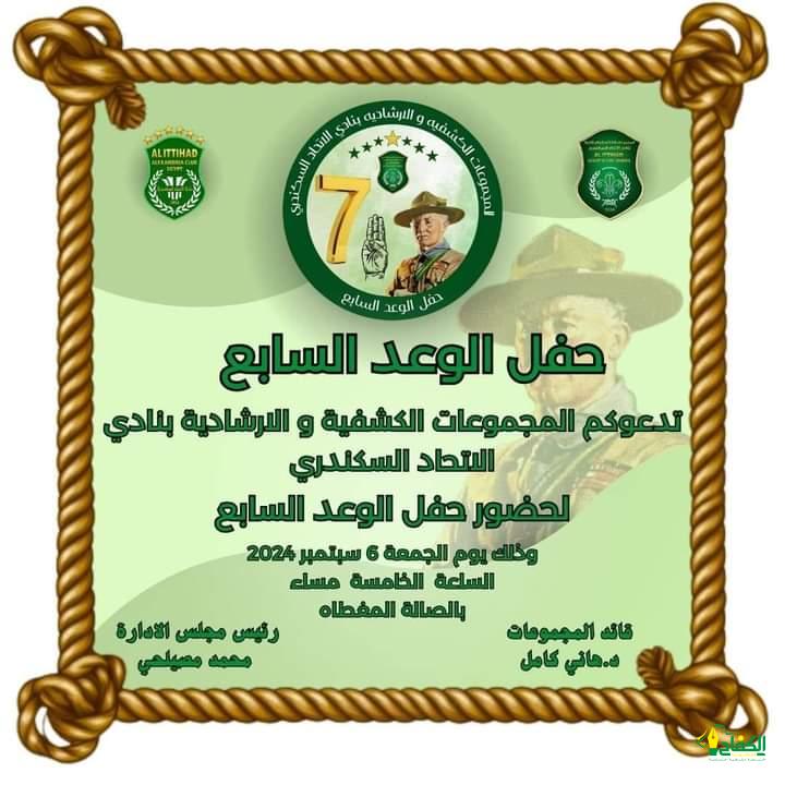 تنظم المجموعات الكشفية والإرشادية بنادي الاتحاد السكندري بجمهورية مصر العربية حفل الوعد السابع غدا الجمعة الساعة الخامسة مساء بنادي الاتحاد السكندري بالشاطبي بمحافظة الاسكندرية واطلق القائمون على ھذا الإحتفال دعوة لجميع القيادات الكشفية لحضور ھذا الحفل ترسيخا لمبادئ الحركة الكشفية.