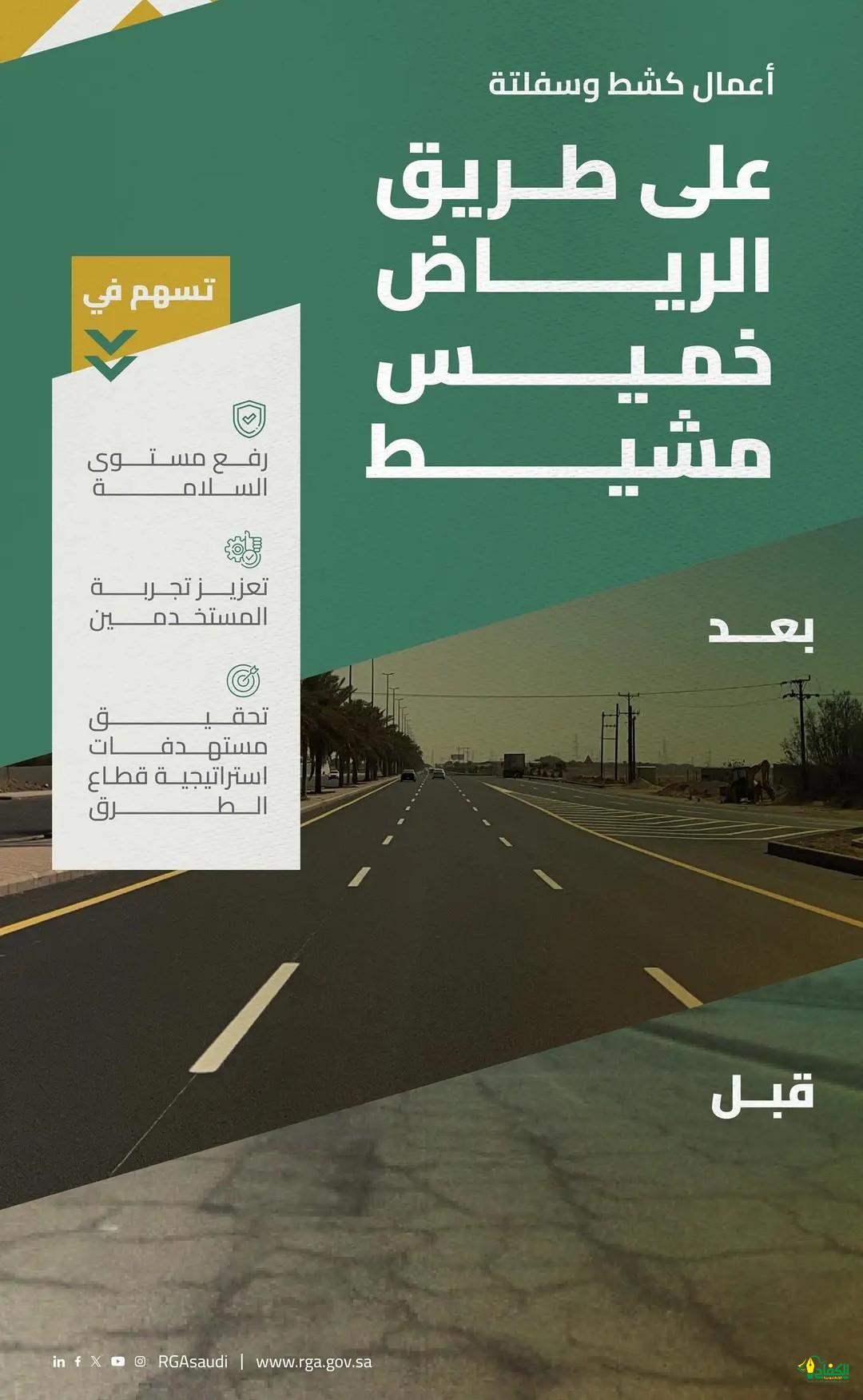 أعلنت الهيئة العامة للطرق عن الانتهاء من أعمال الصيانة على طريق الرياض/ خميس مشيط وذلك في الجزء الواقع بين محافظتي الدلم والخرج.