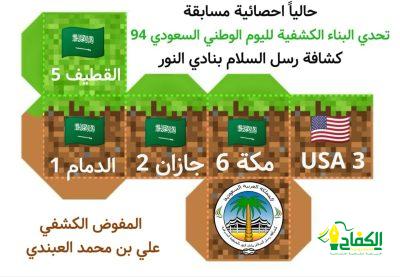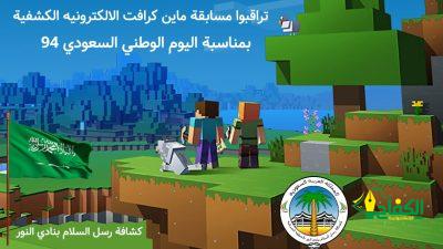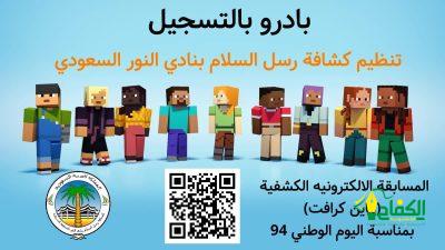 تحت رعاية سعادة نائب رئيس جمعية الكشافة العربية السعودية الدكتور عبد الرحمن بن ابراهيم المديرس تنظم كشافة رسل السلام بنادي النور السعودي بإشراف المفوض الكشفي علي بن محمد العبندي المسابقة الالكترونية الكشفية لليوم الوطني 94 ( ماين كرافت ) تحت مسمى تحدي البناء ) لمرحلة ( الاشبال – والفتيان – والمتقدم ) ( الفراشات – الفتيات – المتقدمات )