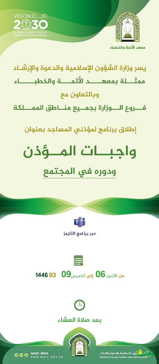 تطلق وزارة الشؤون الإسلامية والدعوة والإرشاد، ممثلة بمعهد الأئمة والخطباء، وبالتعاون مع فروع الوزارة بمختلف مناطق المملكة، برنامجاً لمؤذني المساجد تحت عنوان (واجبات المؤذن ودوره في المجتمع) ، وذلك “عن بعد” عبر برنامج “التايمز”، يقدمه مجموعة من الأكاديميين والمتخصصين، اعتباراً من يوم أمس الاثنين السادس من شهر ربيع الأول 1446هـ، ويستمر لمدة ثلاثة أيام.