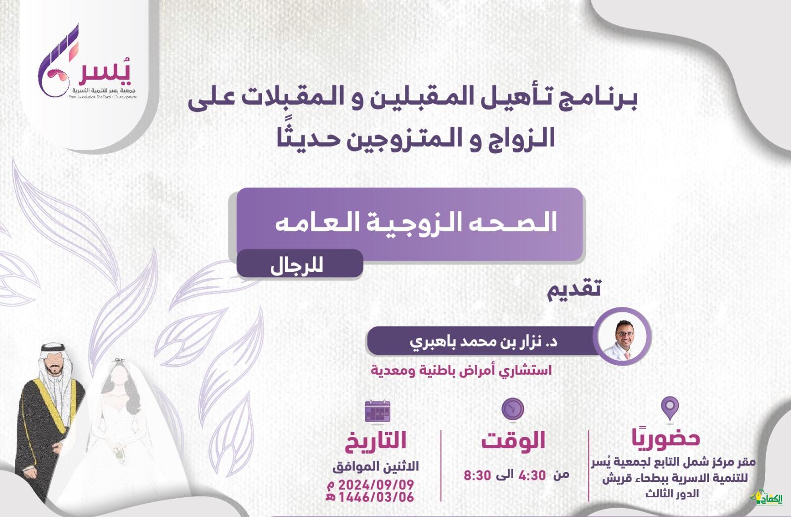 ضمن الأنشطة والبرامج والفعاليات والمبادرات التي تقوم بها جمعية يُسر للتنمية الأسريّة بمكة المكرمة وضمن برنامج تأهيل المقبلين والمقبلات على الزواج والمتزوجين حديثًا وضمن حزمة لقاءات نظمت الجمعية اللقاء الأول بعنوان : (الصحة الزوجية العامة).
