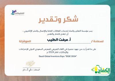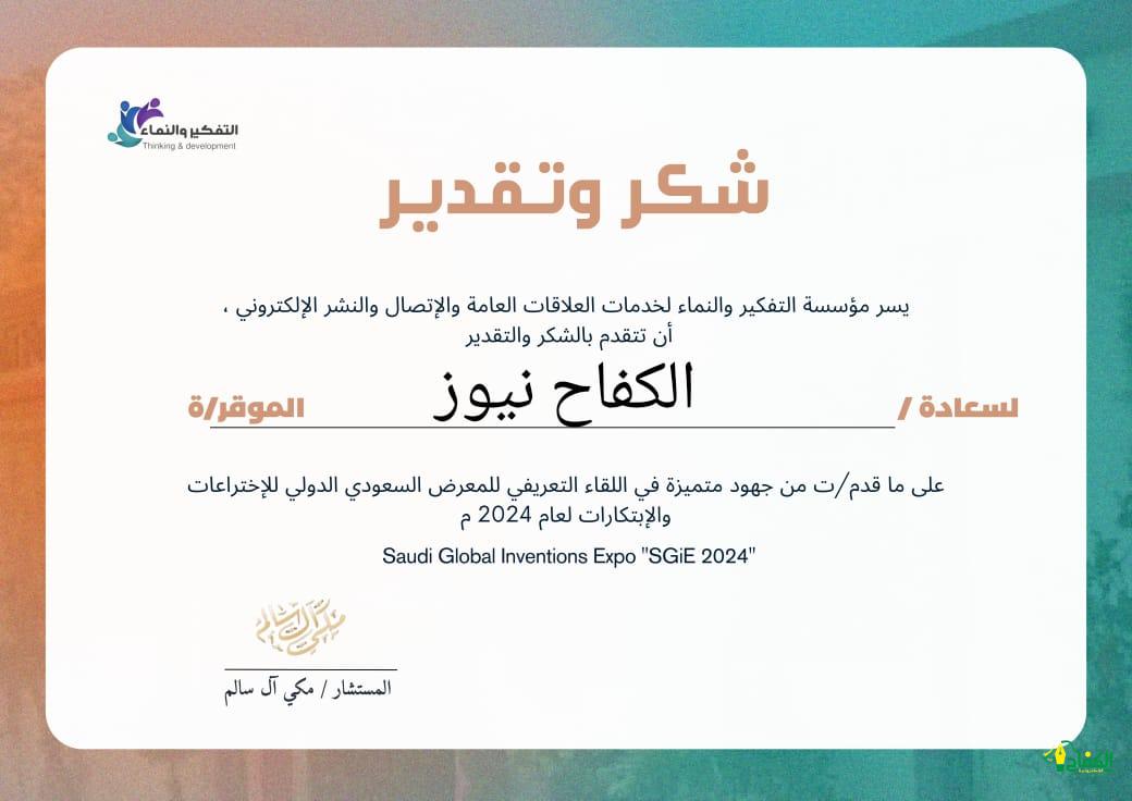 كرمت مؤسسة التفكير والنماء لخدمات العلاقات العامة والإتصال والنشر والإلكتروني – صحيفة الكفاح نيوز الإلكترونية بشهادة شكر وتقدير على ما قدمت من جهود متميزة في اللقاء التعريفي للمعرض السعودي الدولي للإختراعات والإبتكارات 2024 المنعقد في الطائف.
