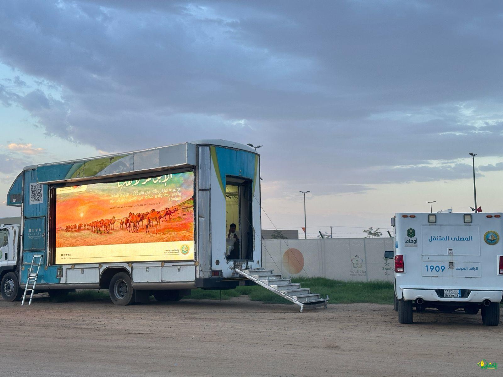 كما جرى تجهيز المنصة لاستخدامها كمصلى متنقل يستوعب قرابة 200 مصلٍ ،بالإضافة إلى إمكانية استخدامها لتوزيع المواد التوعوية من إصدارات الرئاسة العامة.