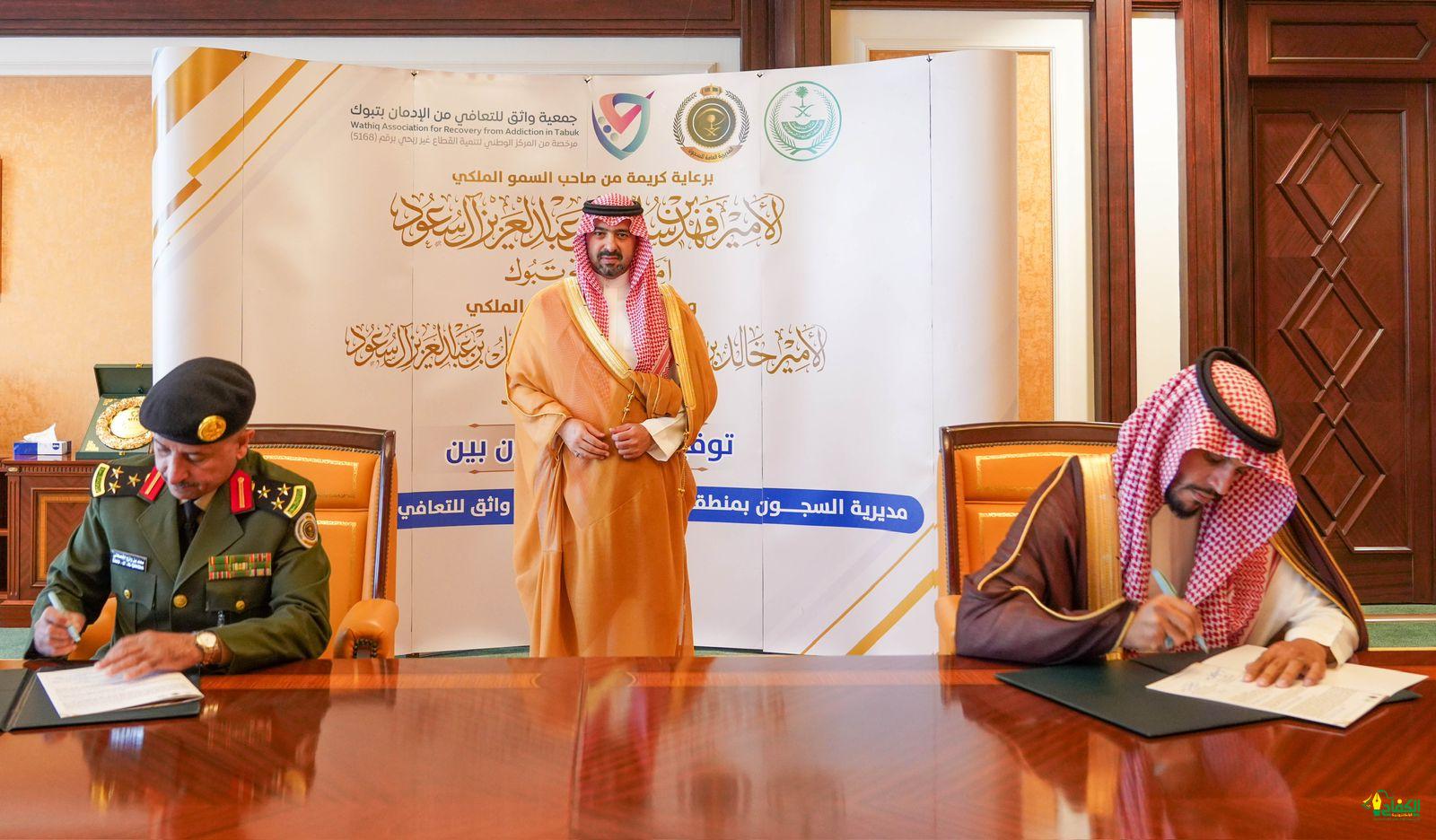 تحت رعاية صاحب السمو الملكي الأمير فهد بن سلطان بن عبدالعزيز أمير منطقة تبوك ، شهد صاحب السمو الملكي الأمير خالد بن سعود بن عبدالله الفيصل بن عبدالعزيز نائب أمير منطقة تبوك، بالإمارة , توقيع اتفاقية تعاون بين مديرية سجون المنطقة وجمعية واثق للتعافي من الإدمان بتبوك بحضور مدير سجون منطقة تبوك العميد سعد بن وازع القحطاني ورئيس مجلس إدارة جمعية واثق للتعافي من الإدمان بتبوك بدر بن محمد العطوي.
